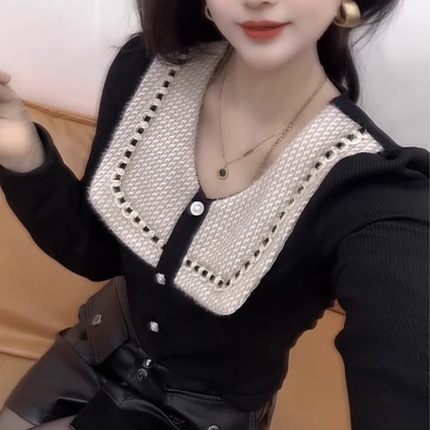 大码黑色撞色拼接长袖上衣女2026年春季新款时尚潮流气质洋气通勤