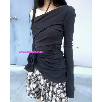 eihey诶嘿蝴蝶结绑带扭结设计感斜肩纯欲风修身辣妹露肩长袖T恤女