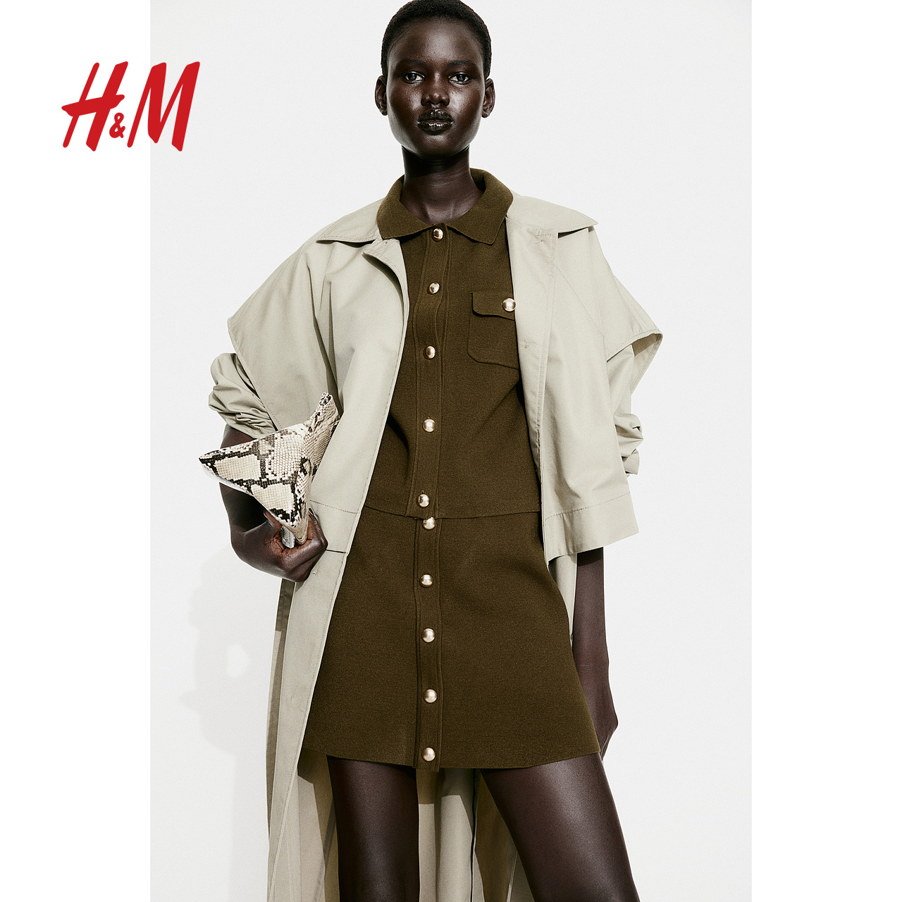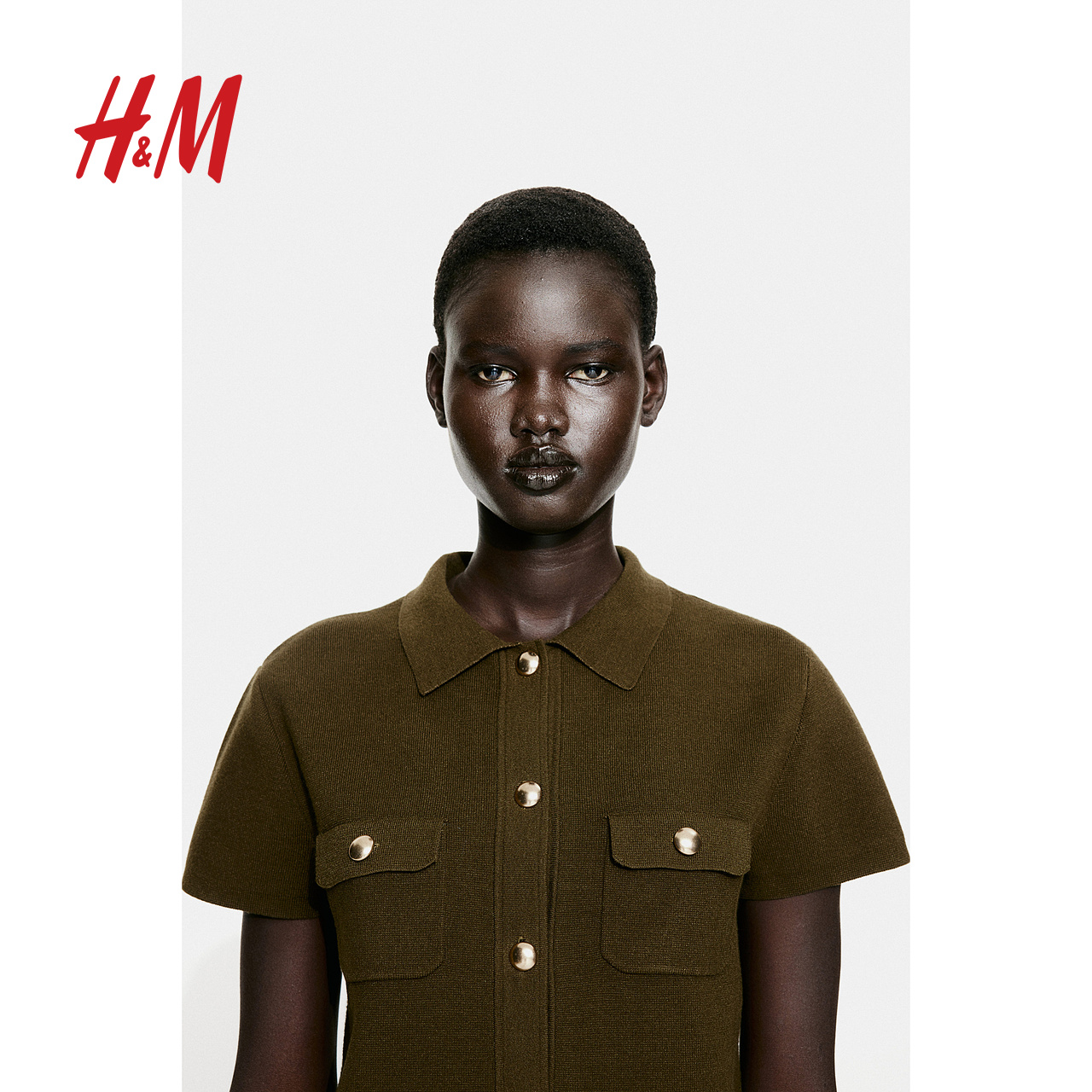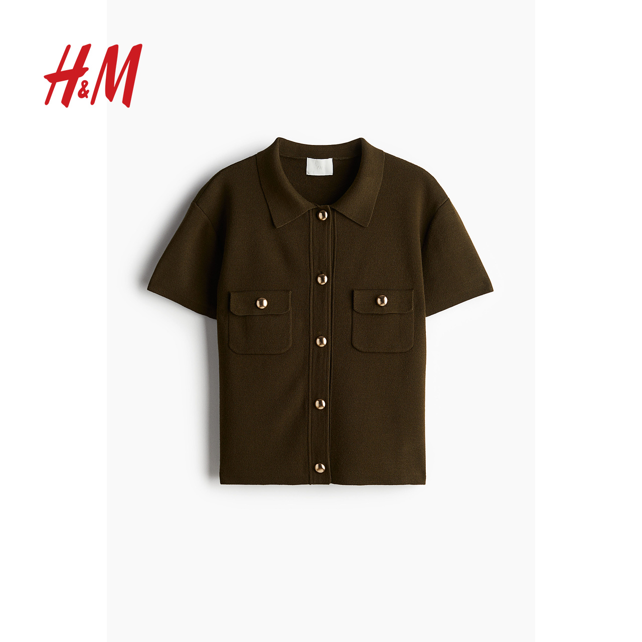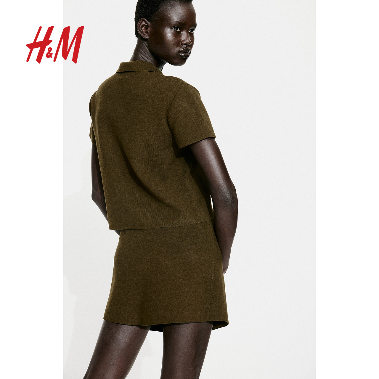 HM女装毛针织衫秋季修身时尚针织翻领短袖短款miu系开衫1255191