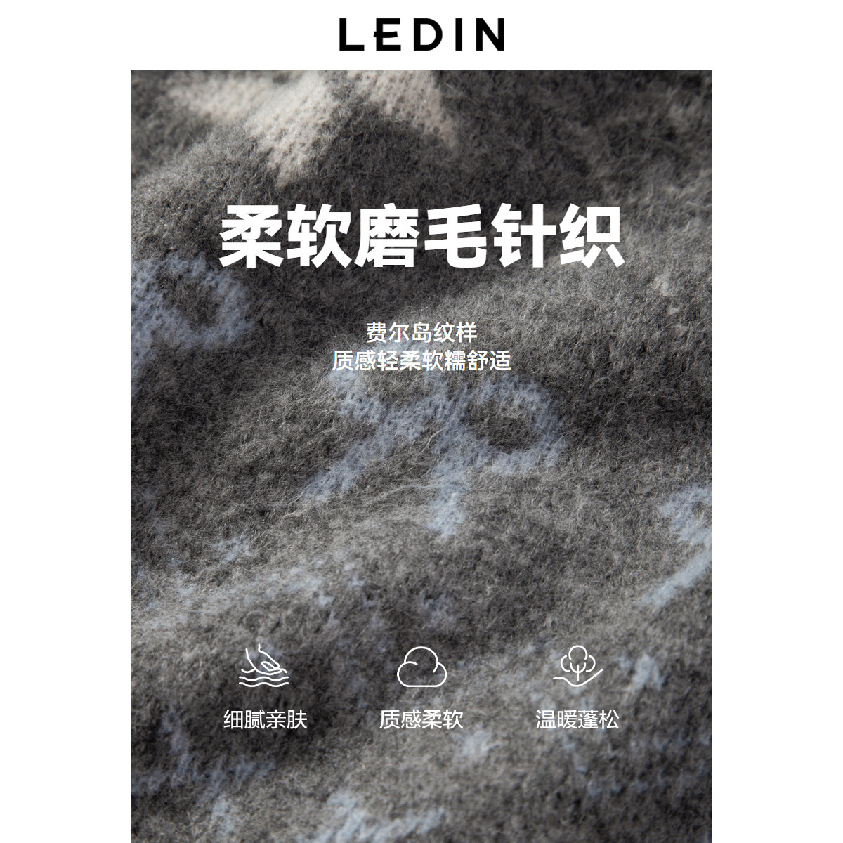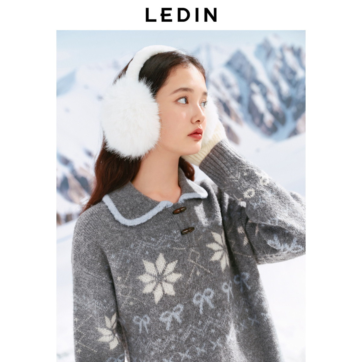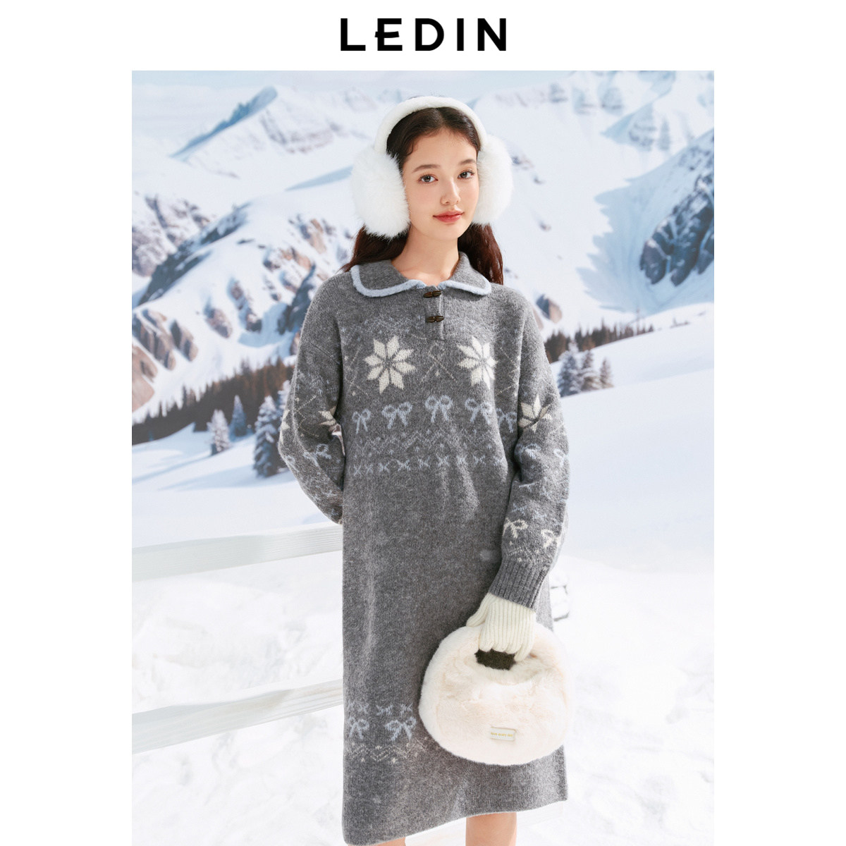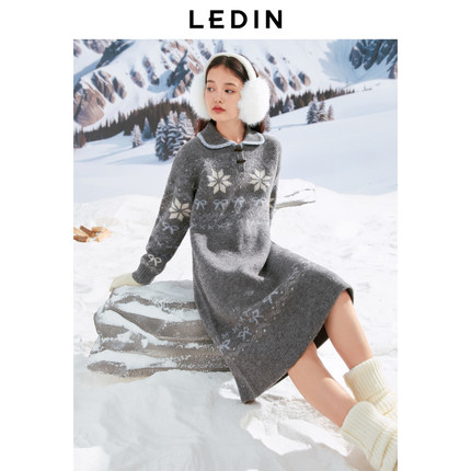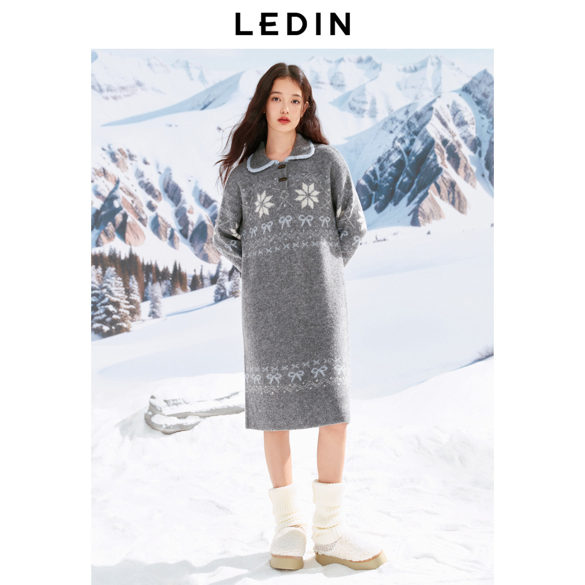 乐町费尔岛长裙年冬新款宽松翻领毛衣裙牛角扣设计灰色连衣裙
