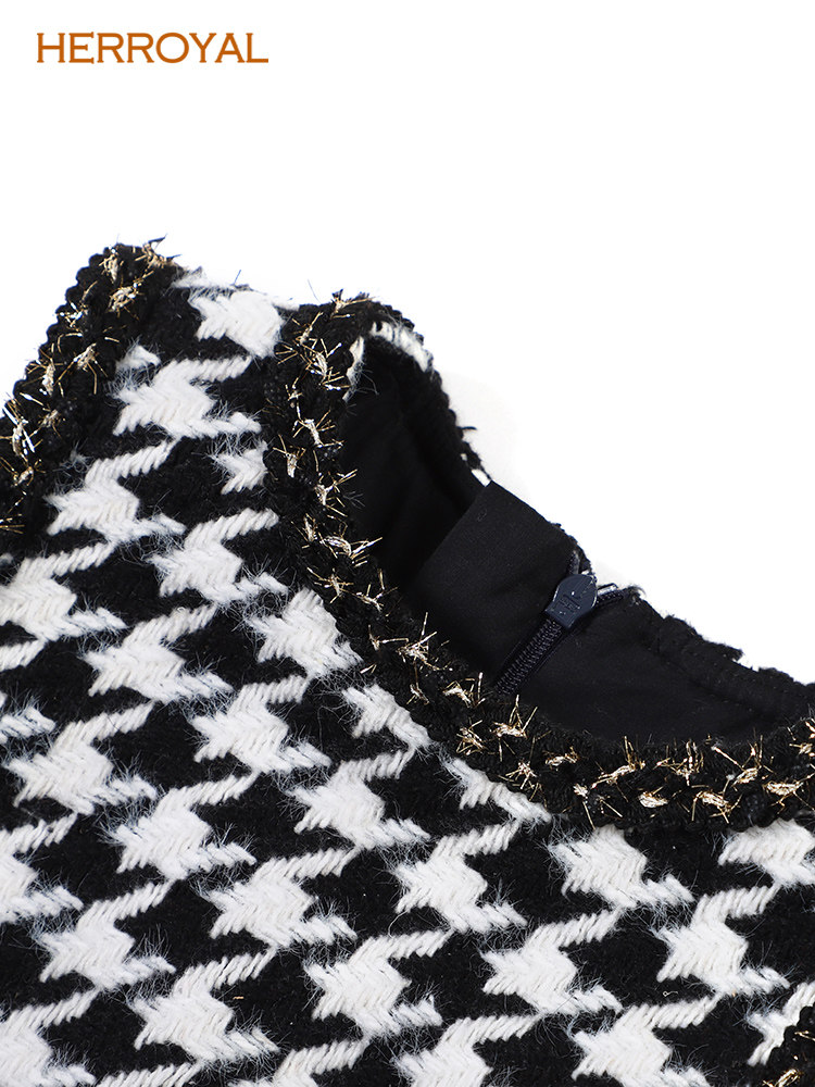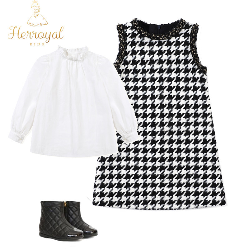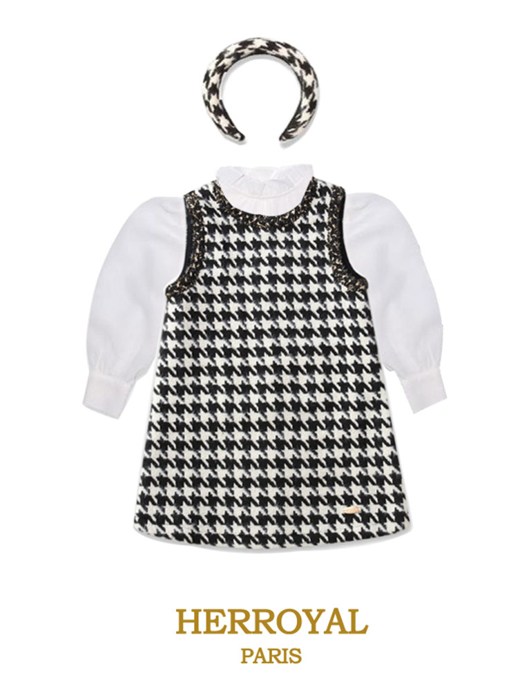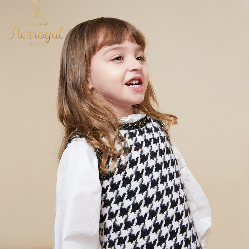 HERROYAL春装小香风镶边千鸟格女童背心裙连衣裙黑白格洋气亲子