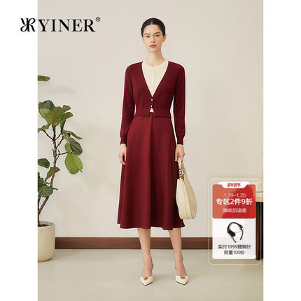 YINER音儿2025秋季新款优雅澳洲美丽诺羊毛撞色拼接假两件连衣裙
