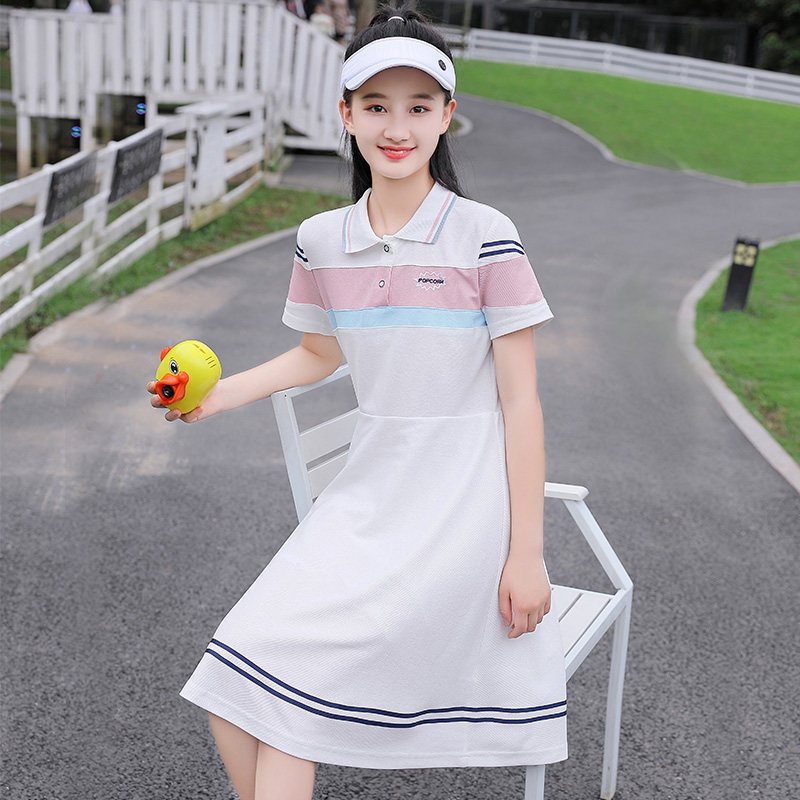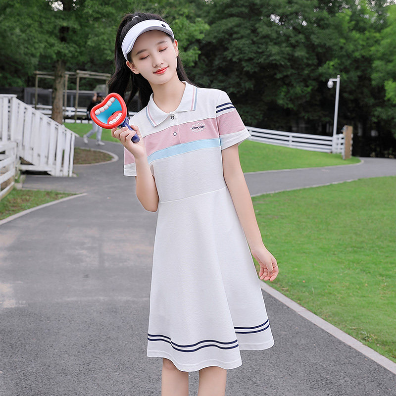 少女连衣裙夏装初中学生女孩高中生学院风长款polo领大童裙子韩版