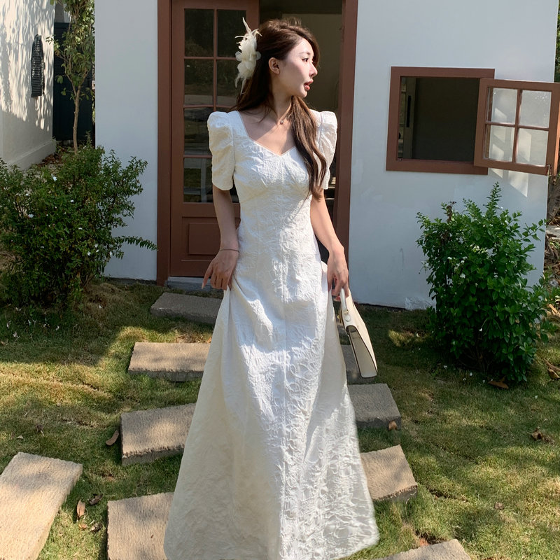 130厘米高个子原创设计夏季新款浮雕提花收腰显瘦领证短袖连衣裙