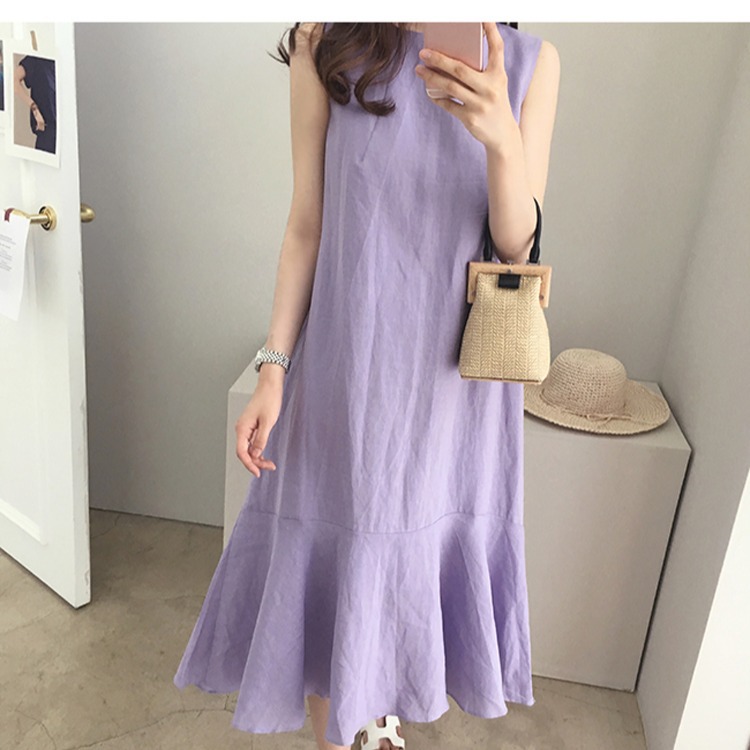 轻熟风无袖连衣裙女夏温柔香芋紫小个子a字天丝棉麻铜氨丝背心裙