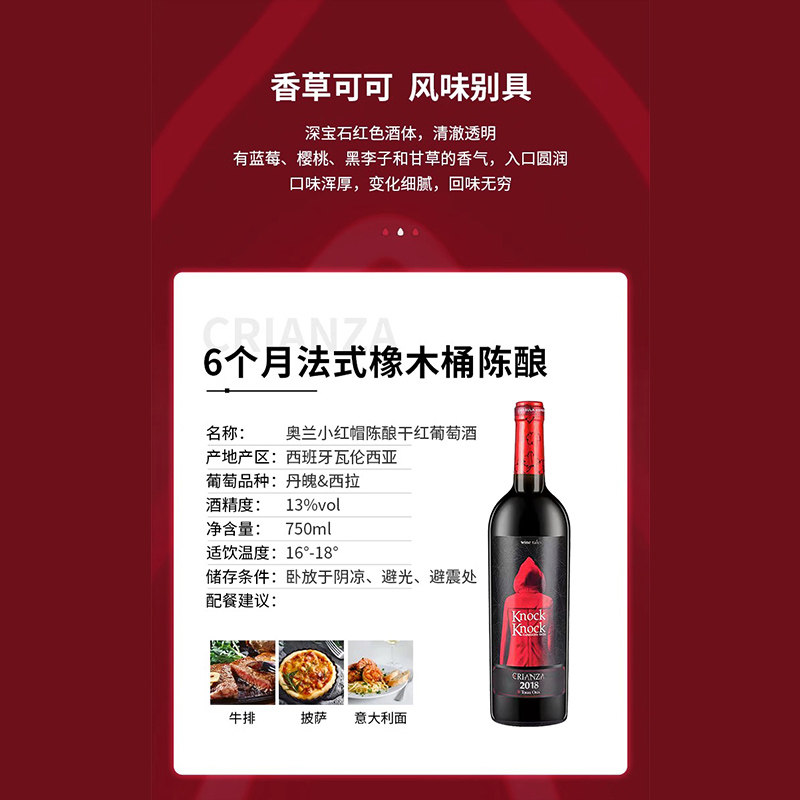 奥兰小红帽陈酿干红葡萄酒6个月法式橡木桶N1女士热红酒西班牙