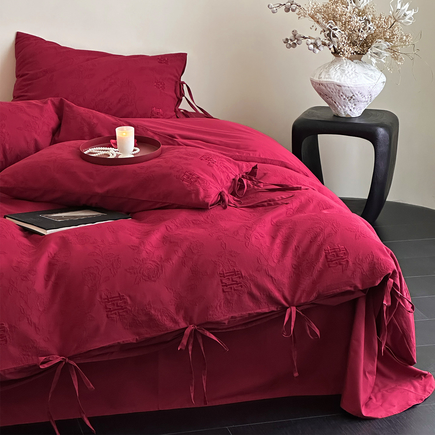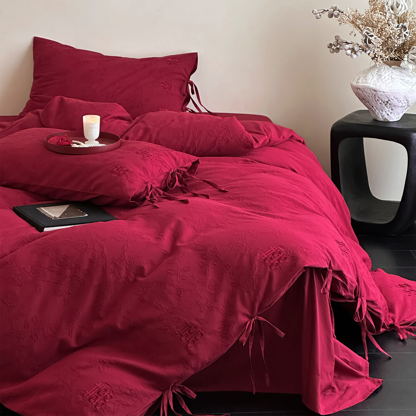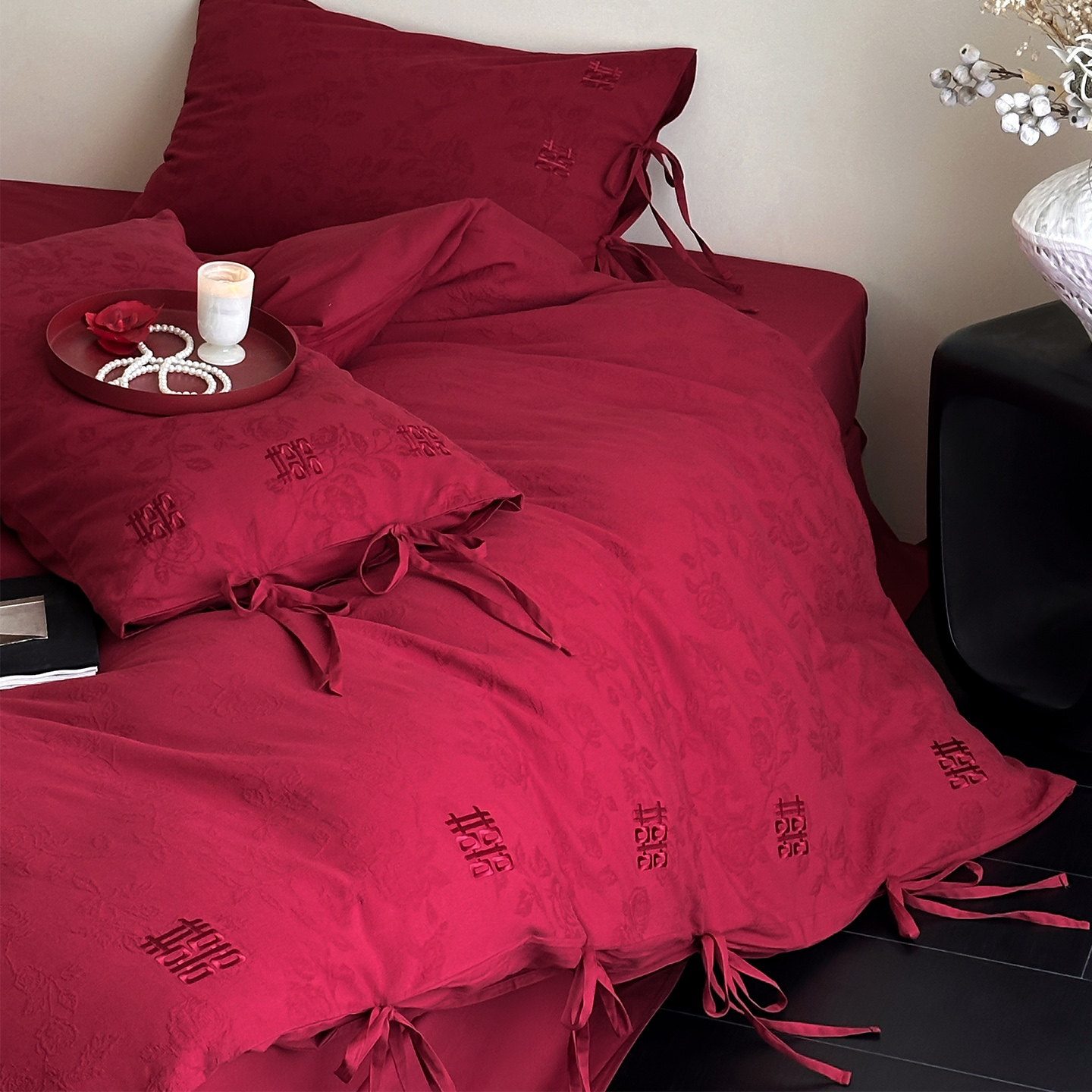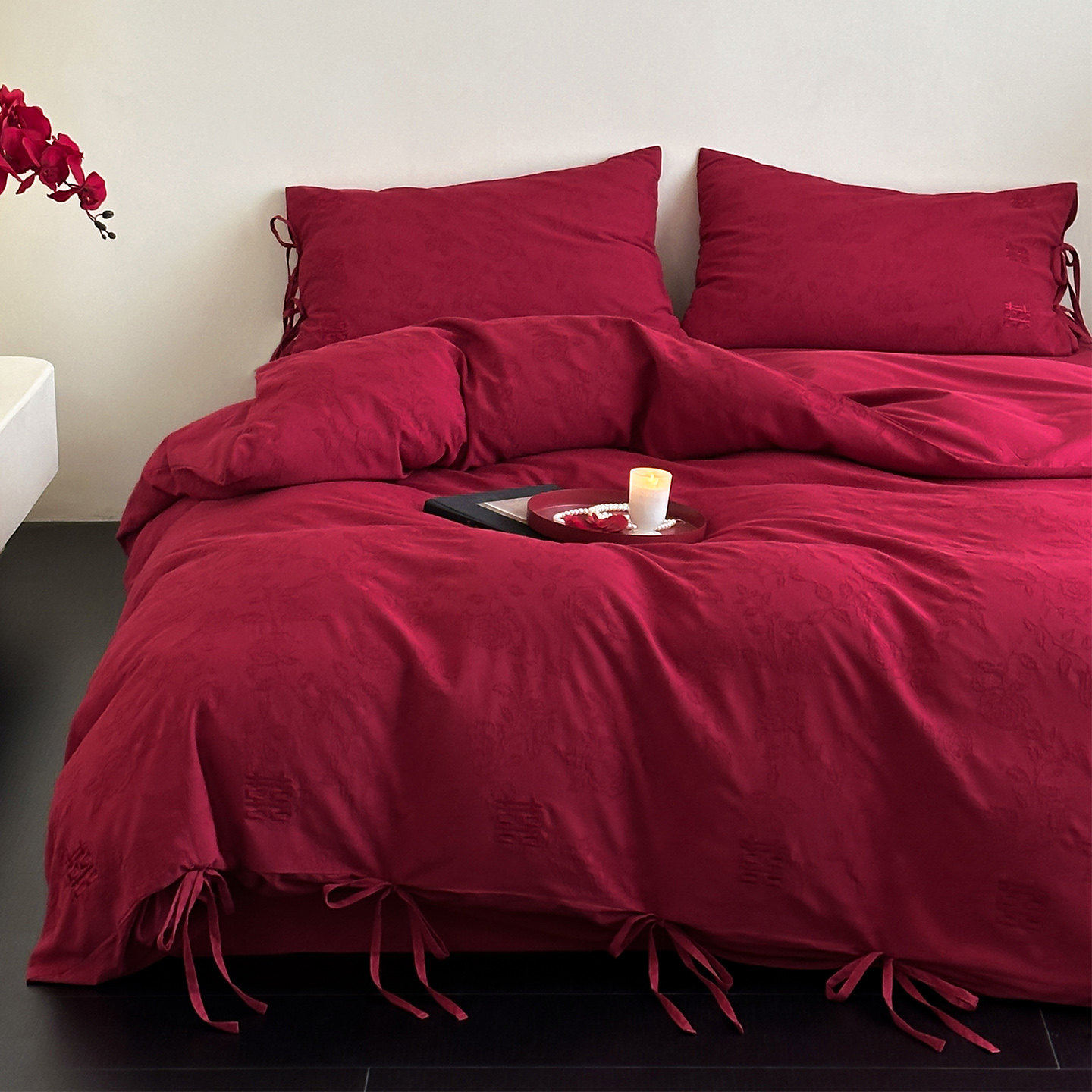 LANSWAY双喜刺绣婚庆四件套全棉水洗棉提花结婚红色2米被套床单