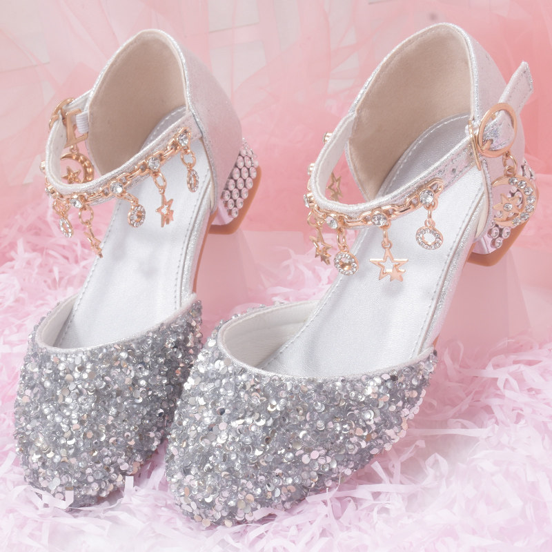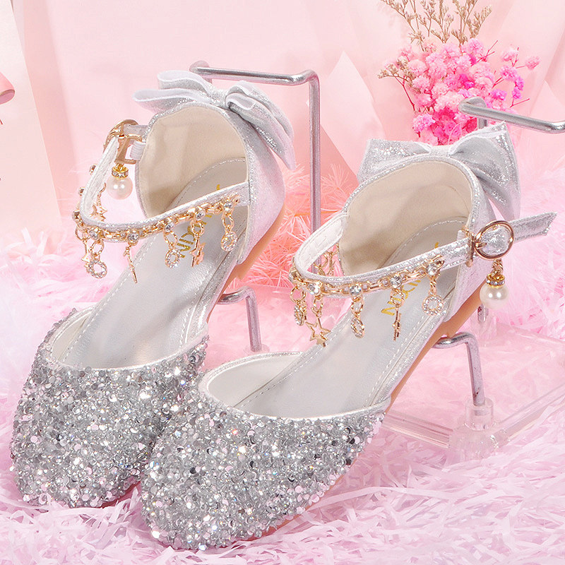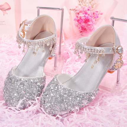 水晶鞋女儿童高跟公主鞋女童配礼服银白色模特演出中大童闪亮鞋子