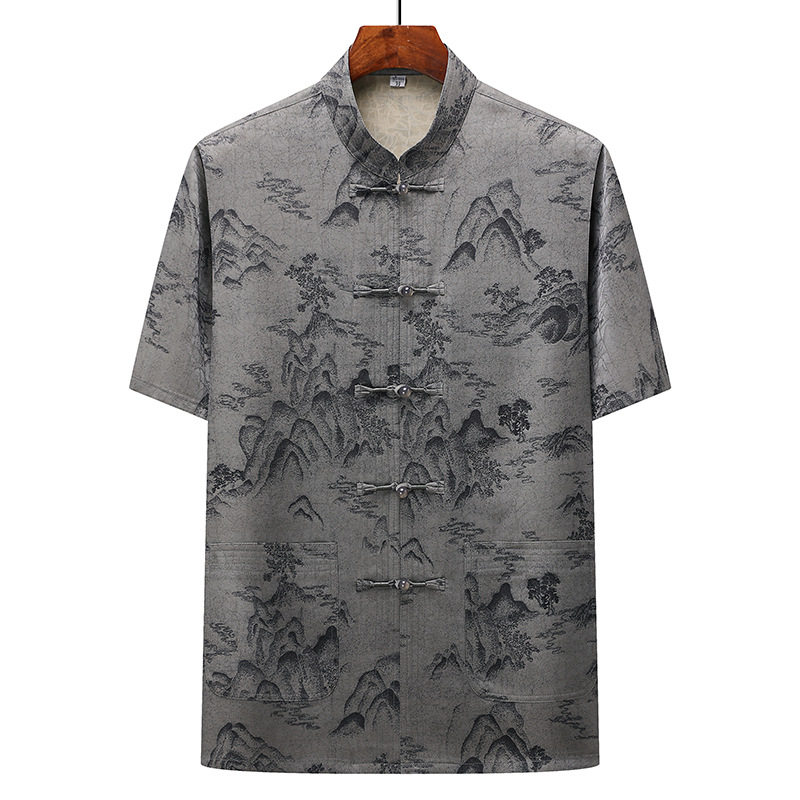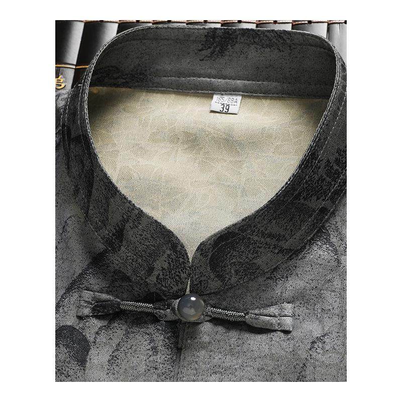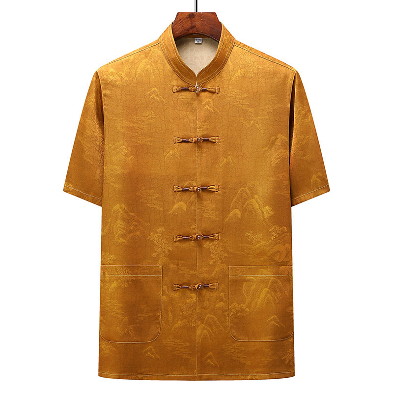高版中老年人唐装男士中国风夏季薄款冰丝短袖套装爸爸立领衬衫上