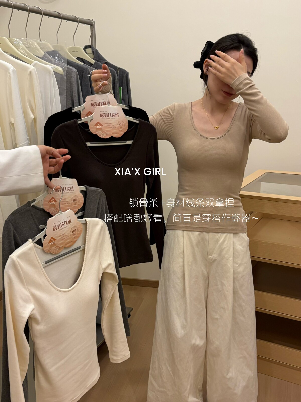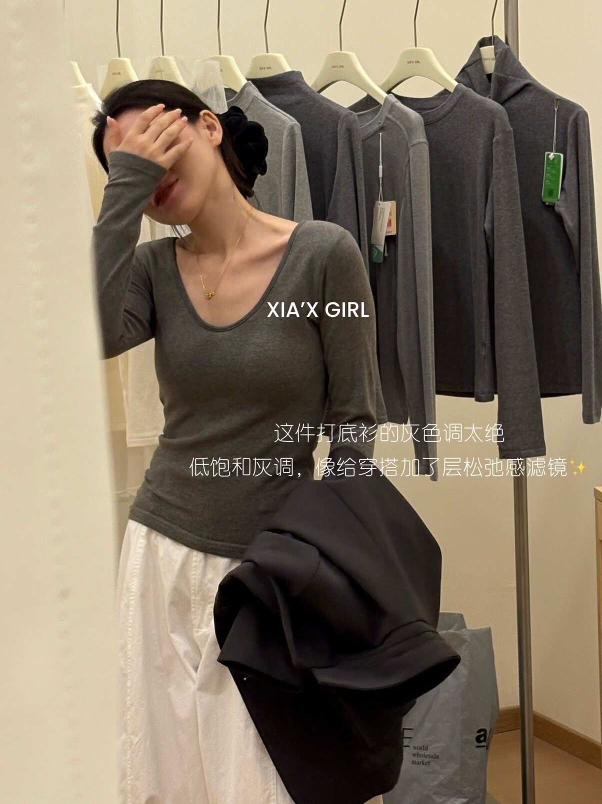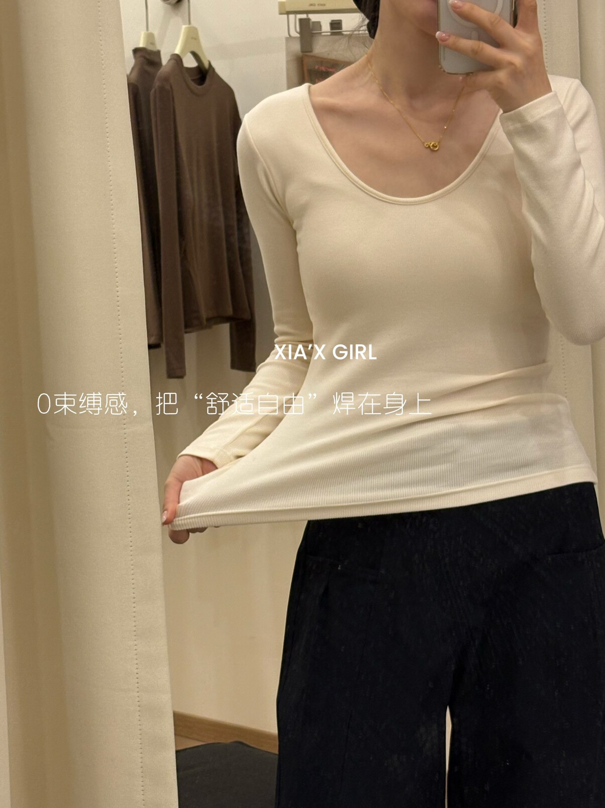 FULL OF CHARM 鹅蛋领长袖上衣女U领带胸垫优棉磨毛打底衫可外穿