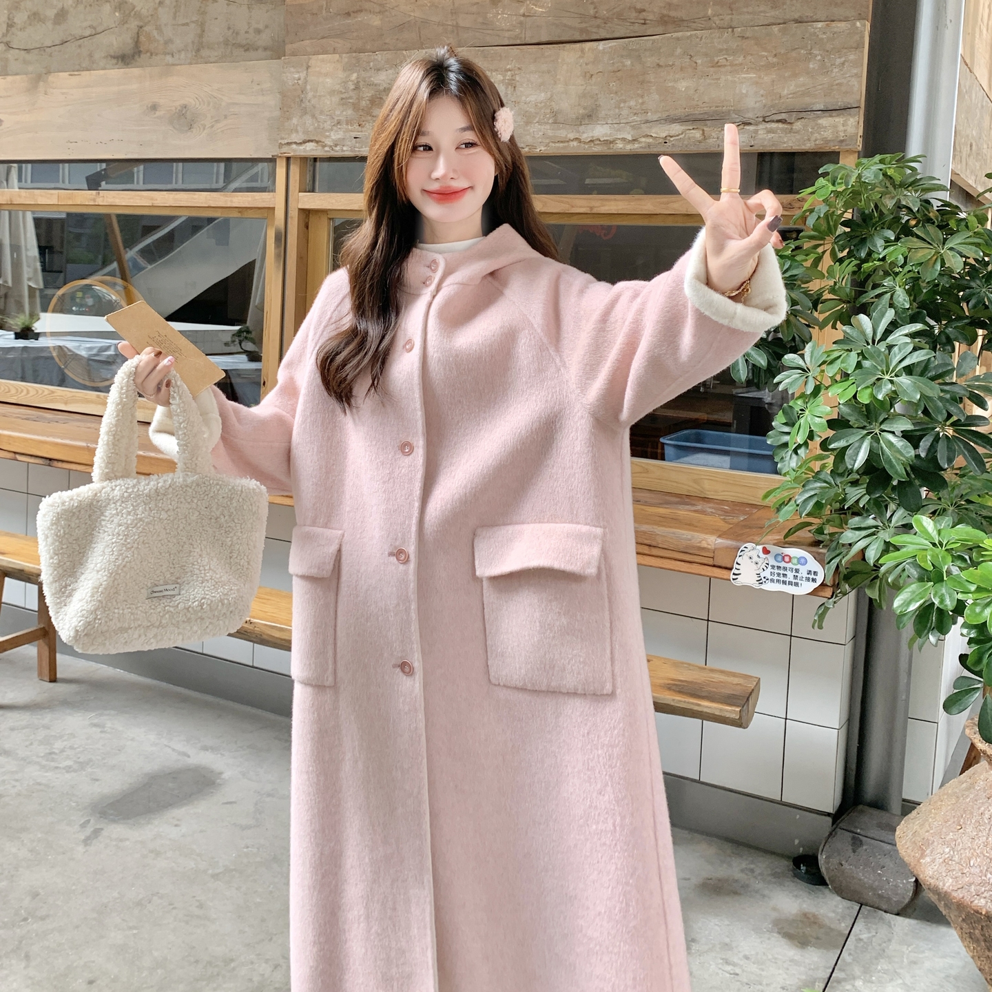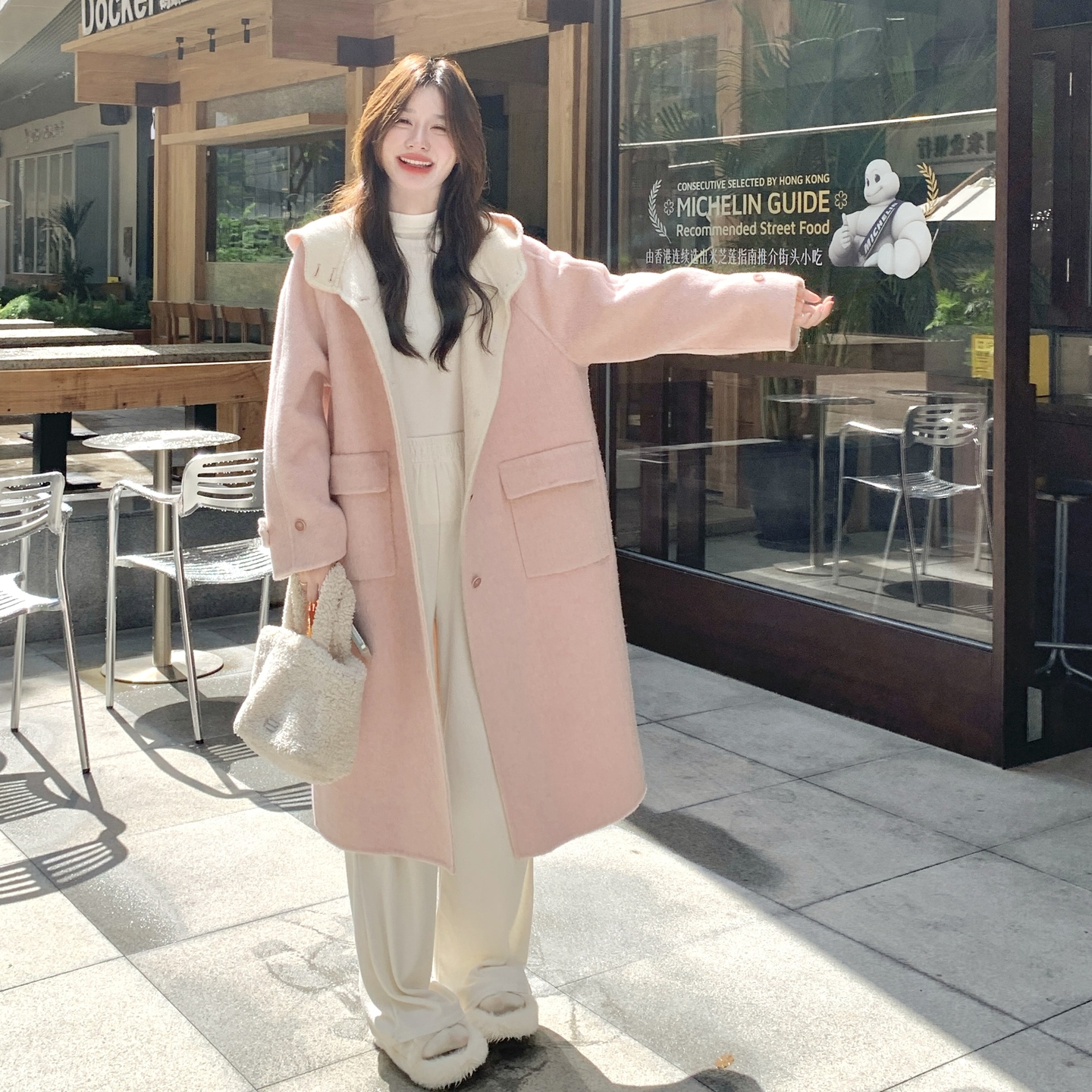 新款现 货!冬季连帽粉色大口袋长款双面羊绒大衣D912-P290K378