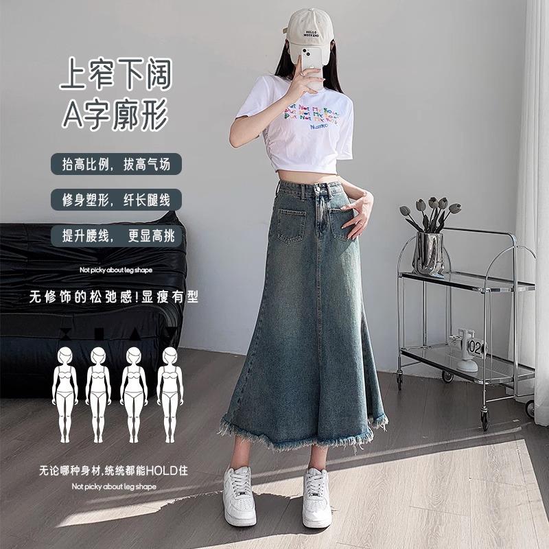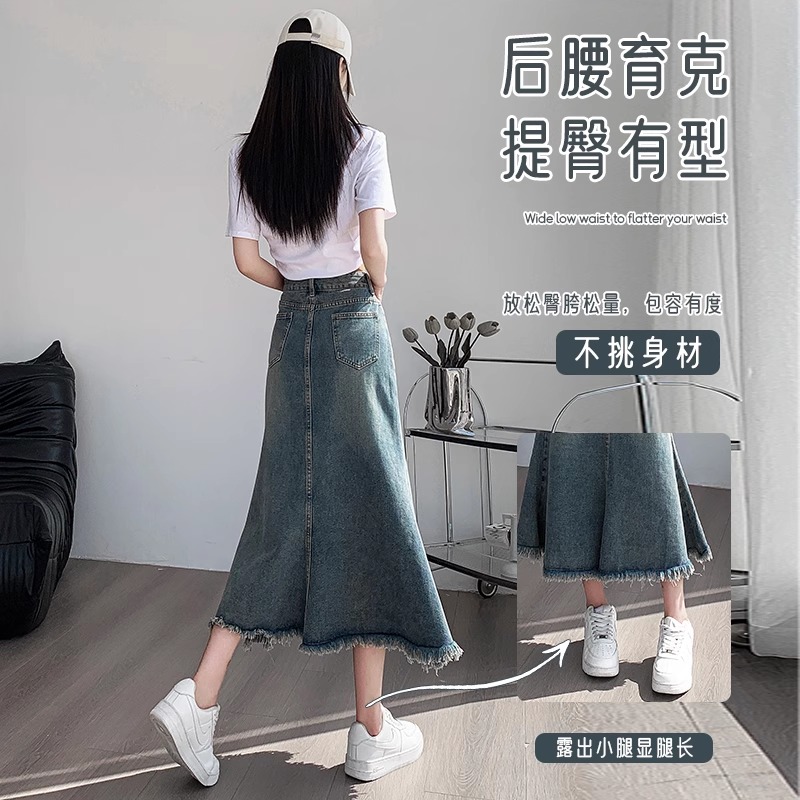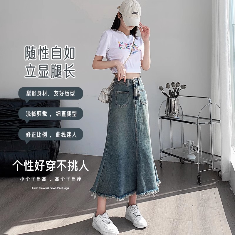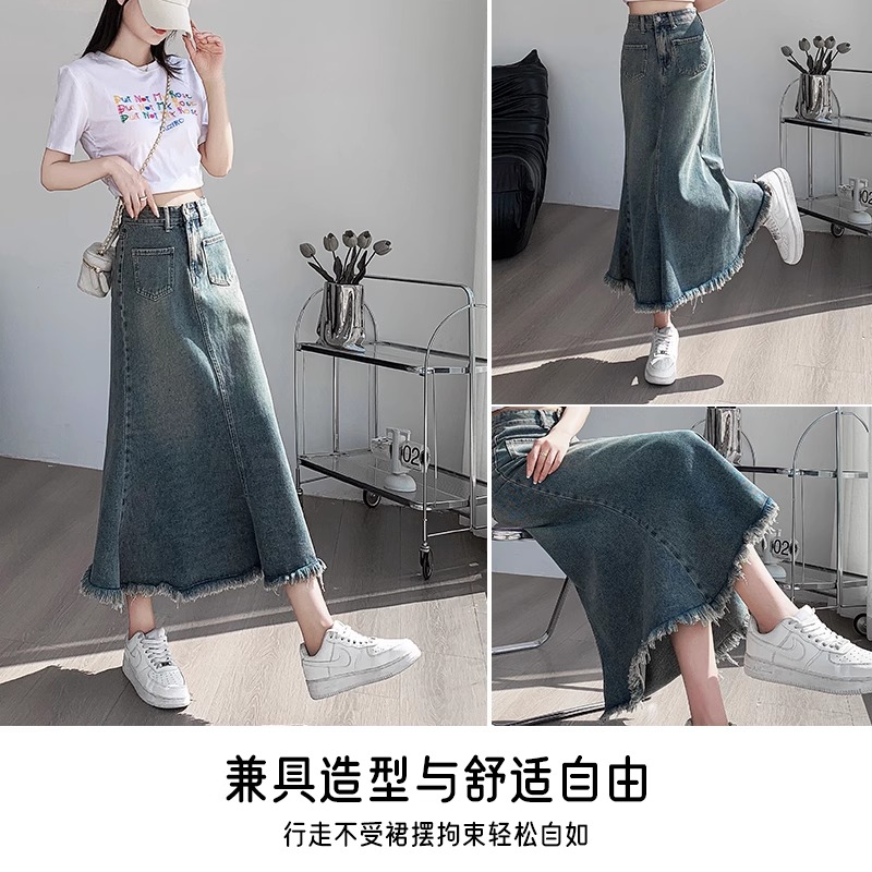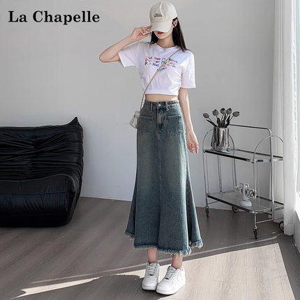 拉夏贝尔复古毛边牛仔半身裙女秋季新款高腰a字包臂鱼尾中长裙子M