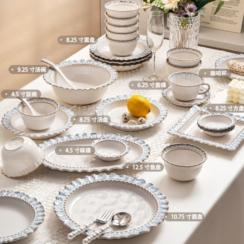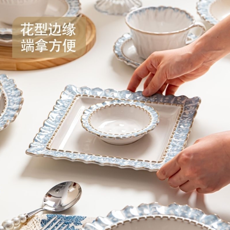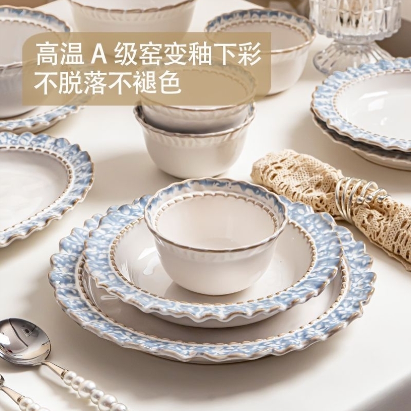 烟蓝法式陶瓷家用餐具ins新款饭碗复古感轻奢高级碗碟套装碗盘