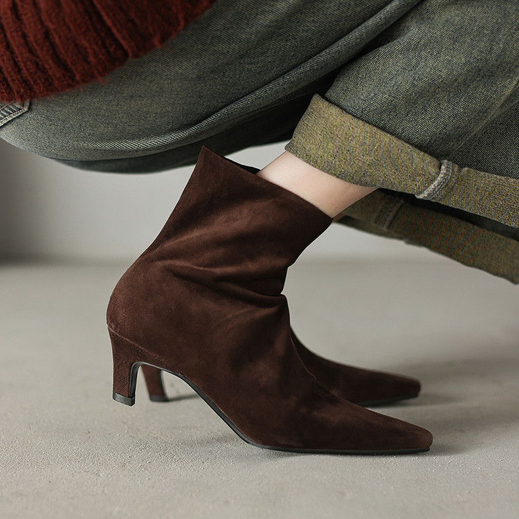 巨好看的法式气质真皮尖头短靴女细跟2025新款短筒靴子超火时尚