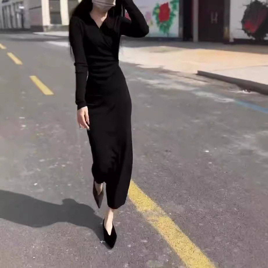 24695大爱美依缘2025秋季新款纯色V领长袖修身连衣裙时尚显瘦