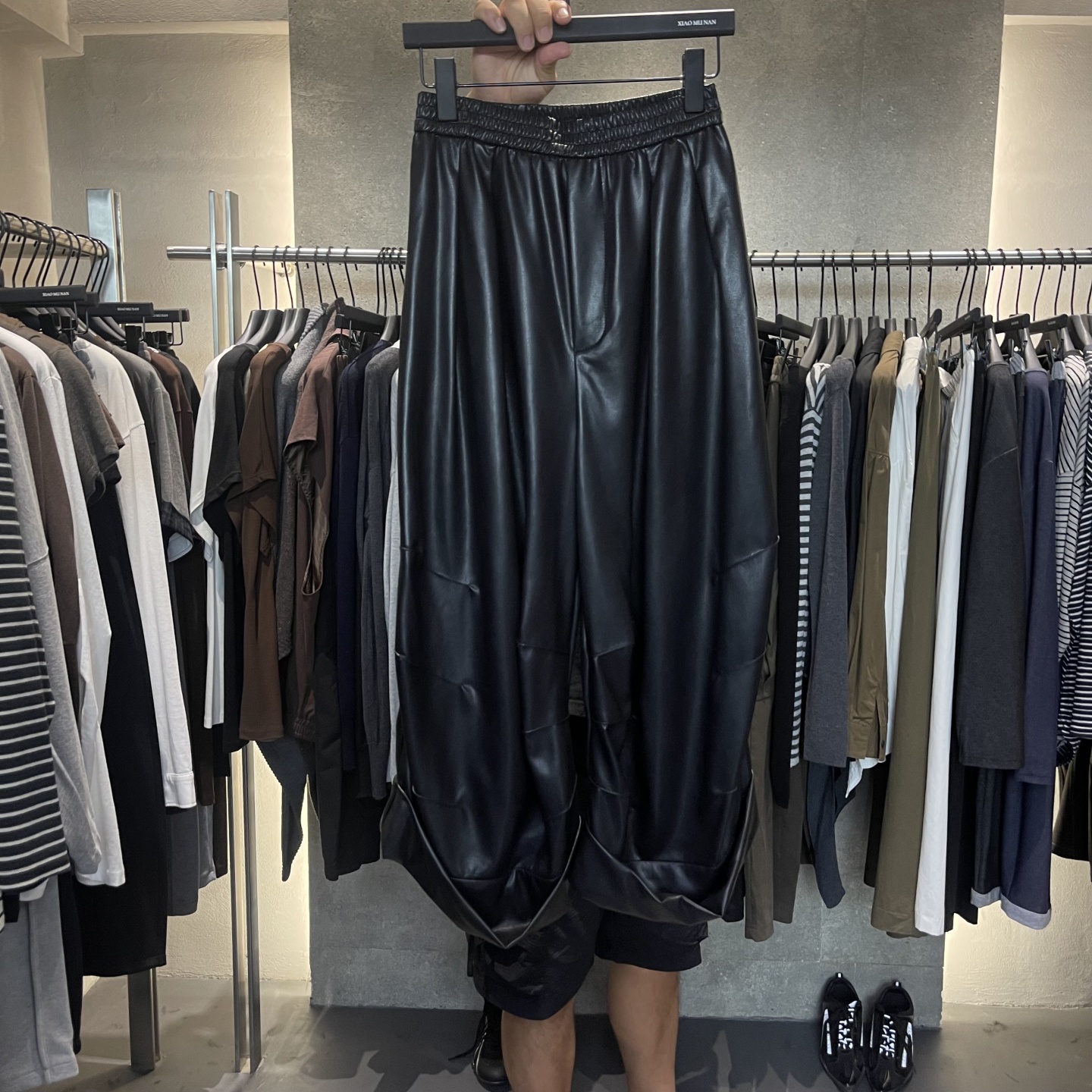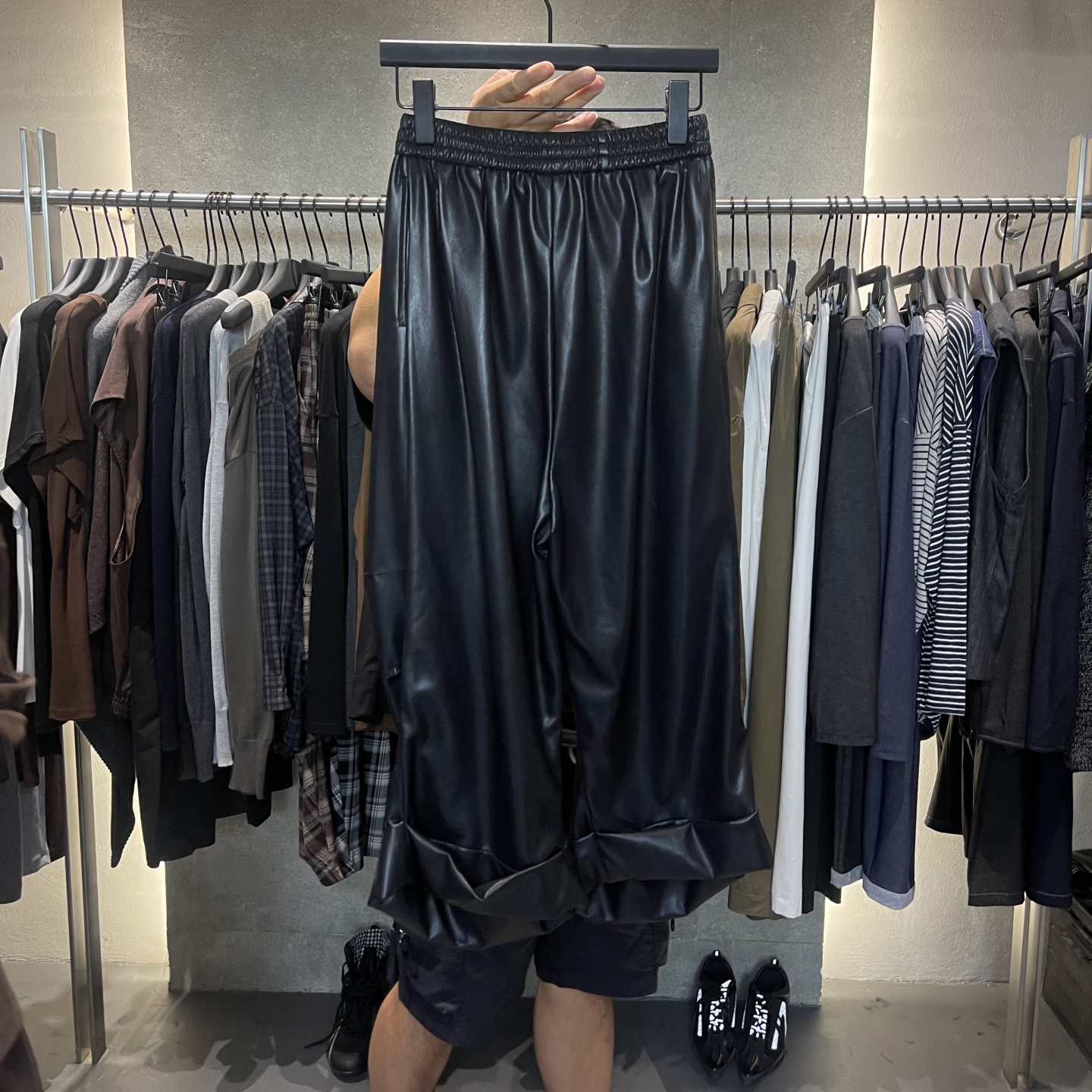 2025秋季新款褶皱设计阔腿九分裤女高腰百搭宽松显瘦卷边pu皮裤女