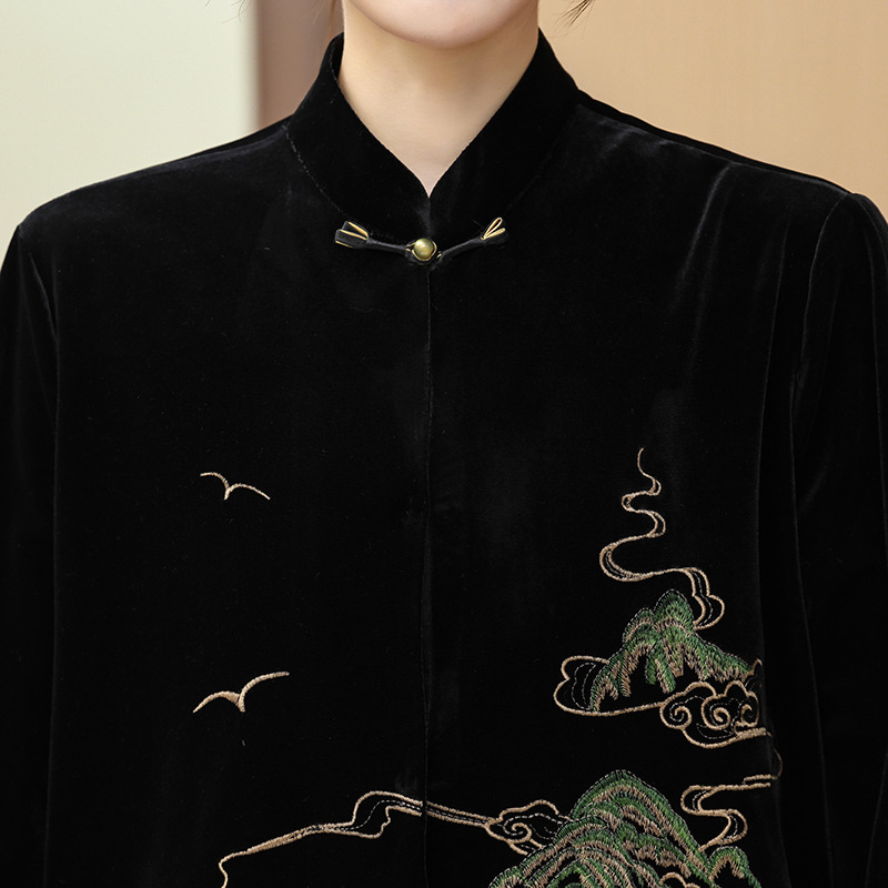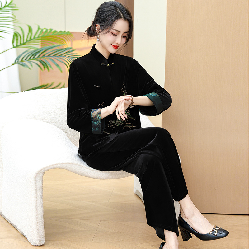 春秋新款中式妈妈装两件套女士中年套装时尚丝绒修身服装中老年女