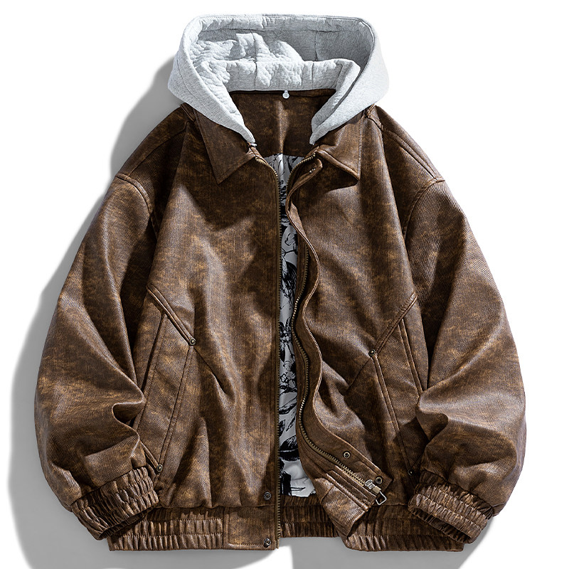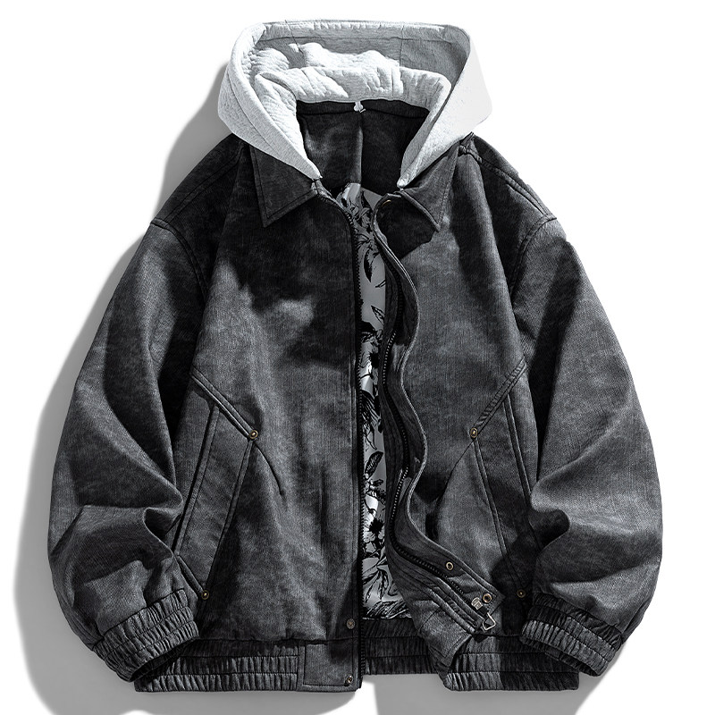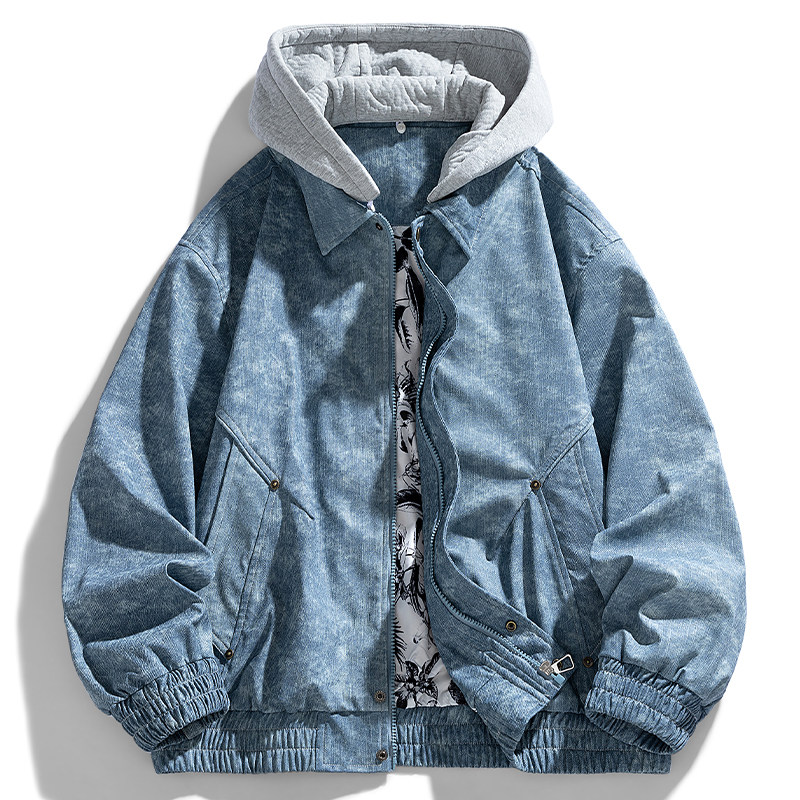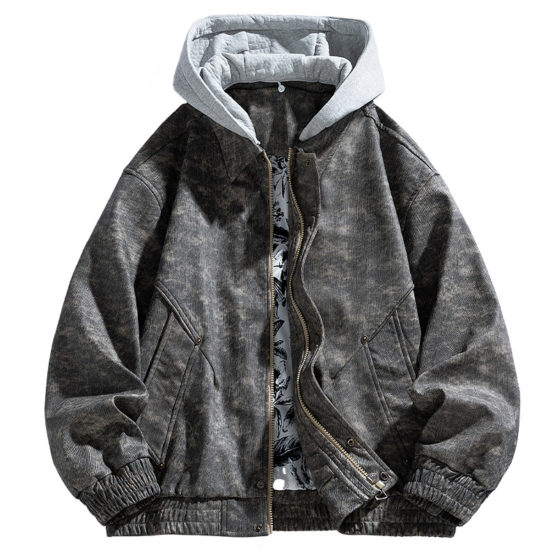 罗蒙重磅扎染假两件飞行夹克男秋季潮牌宽松大码开衫连帽工装外套