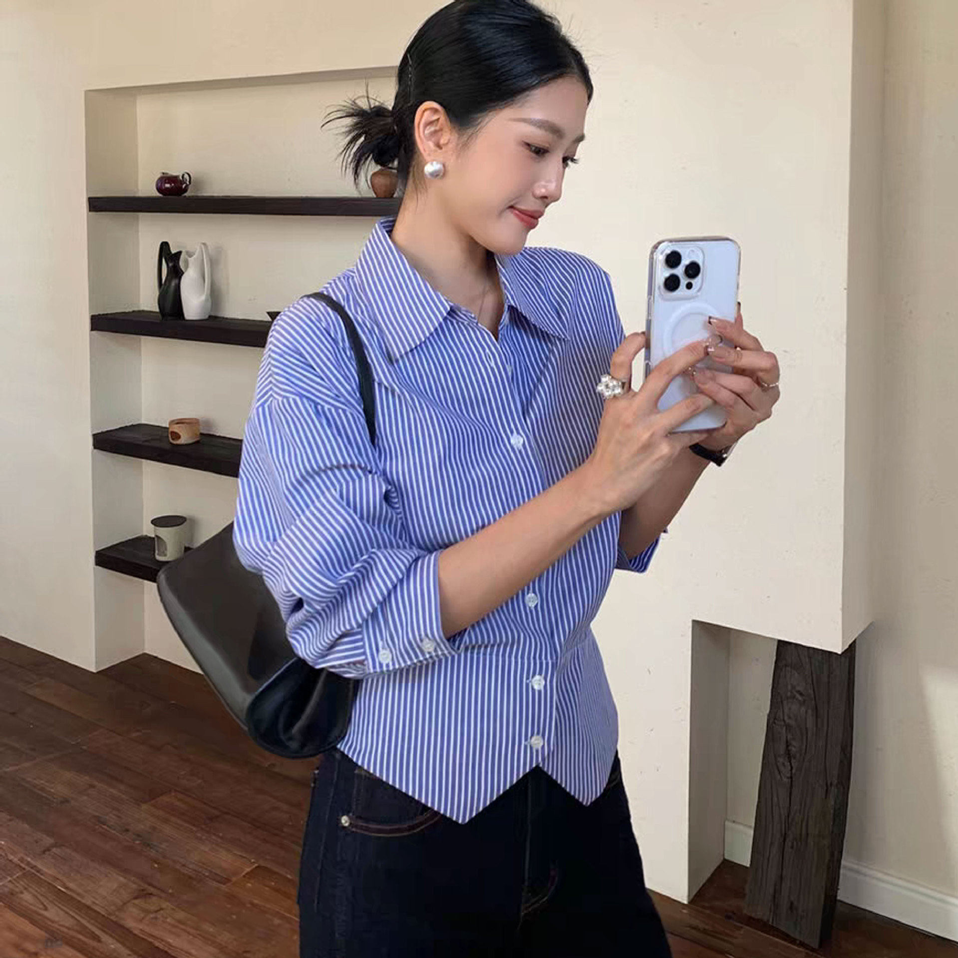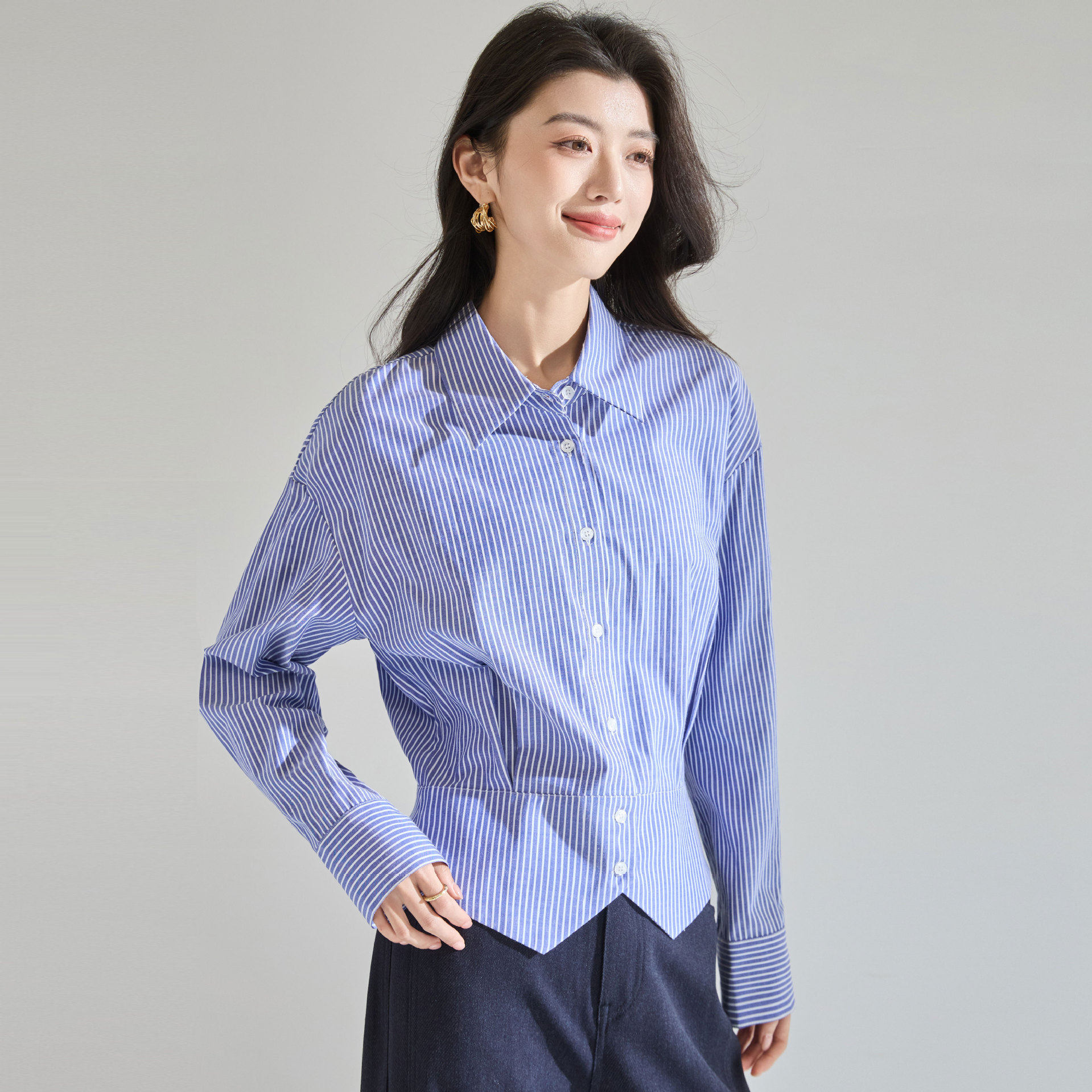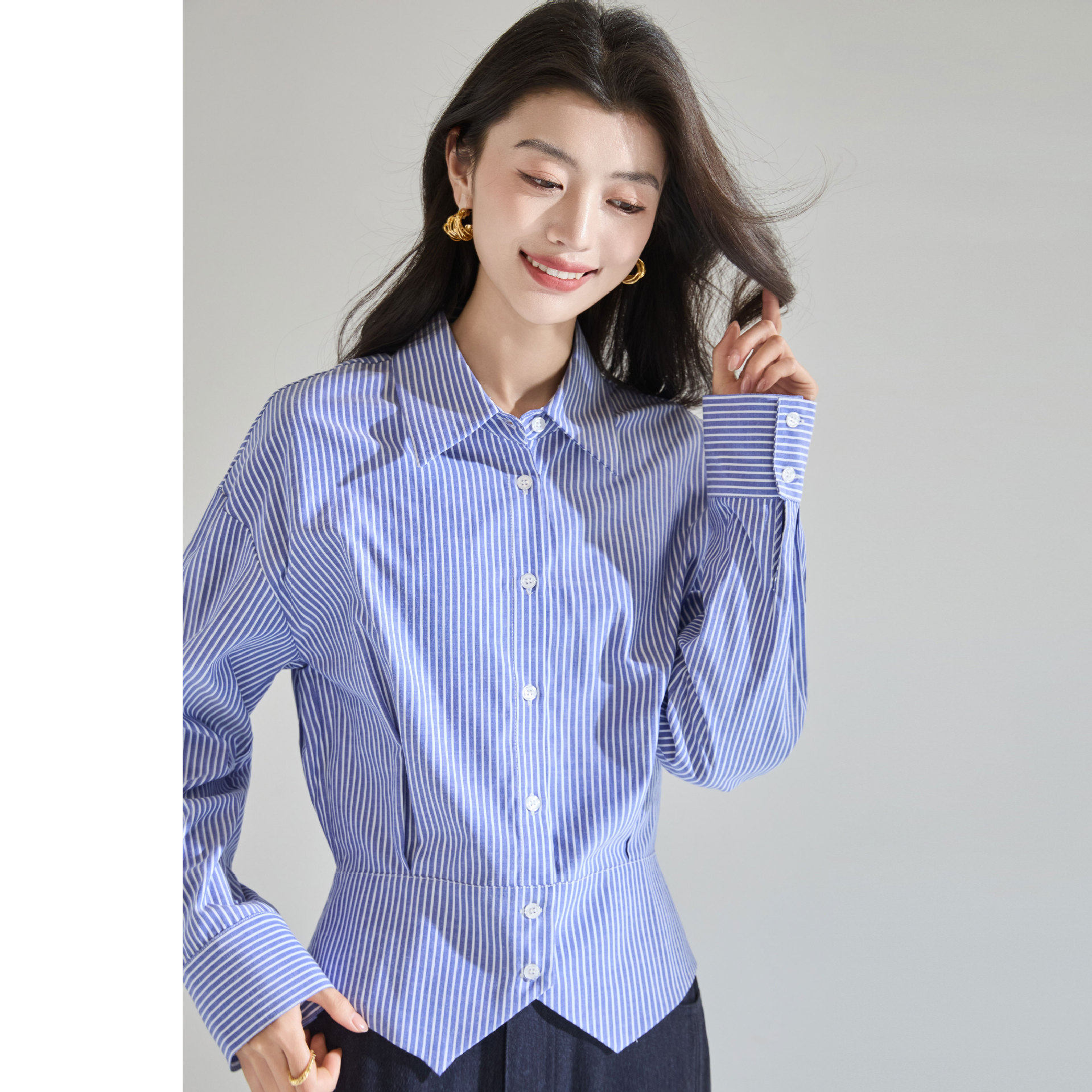 沐珊26春季miu系蓝色条纹收腰衬衫抗皱免烫气质休闲百搭通勤衬衣