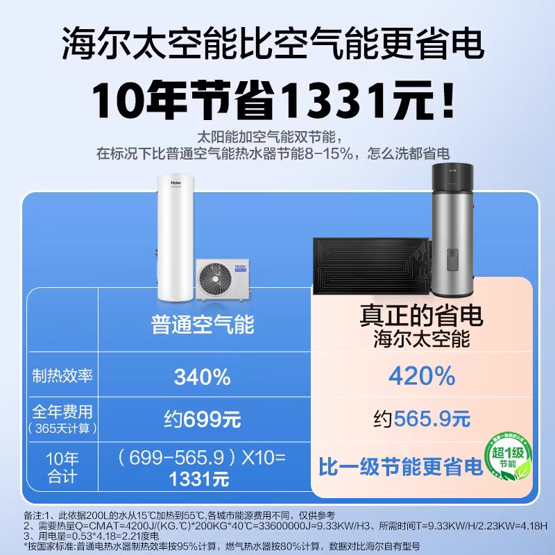 海尔太阳能新型太空能热水器家用200L光电空气源一级能效热泵BQ7