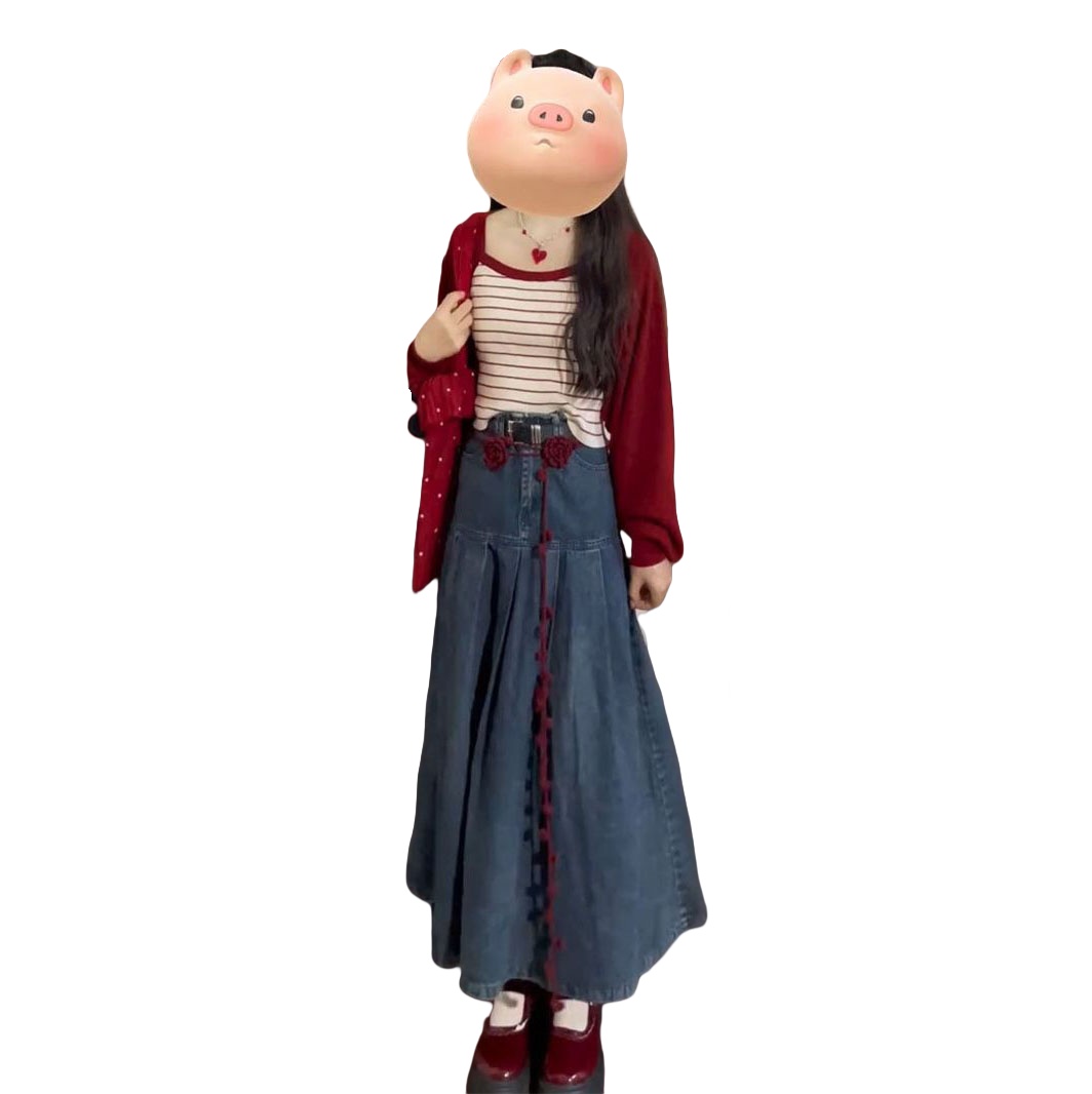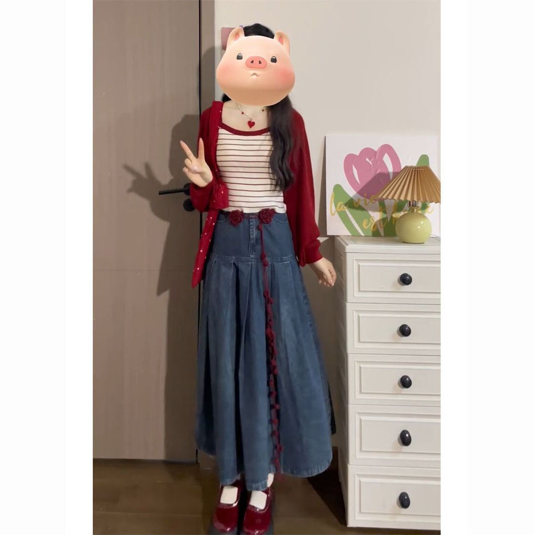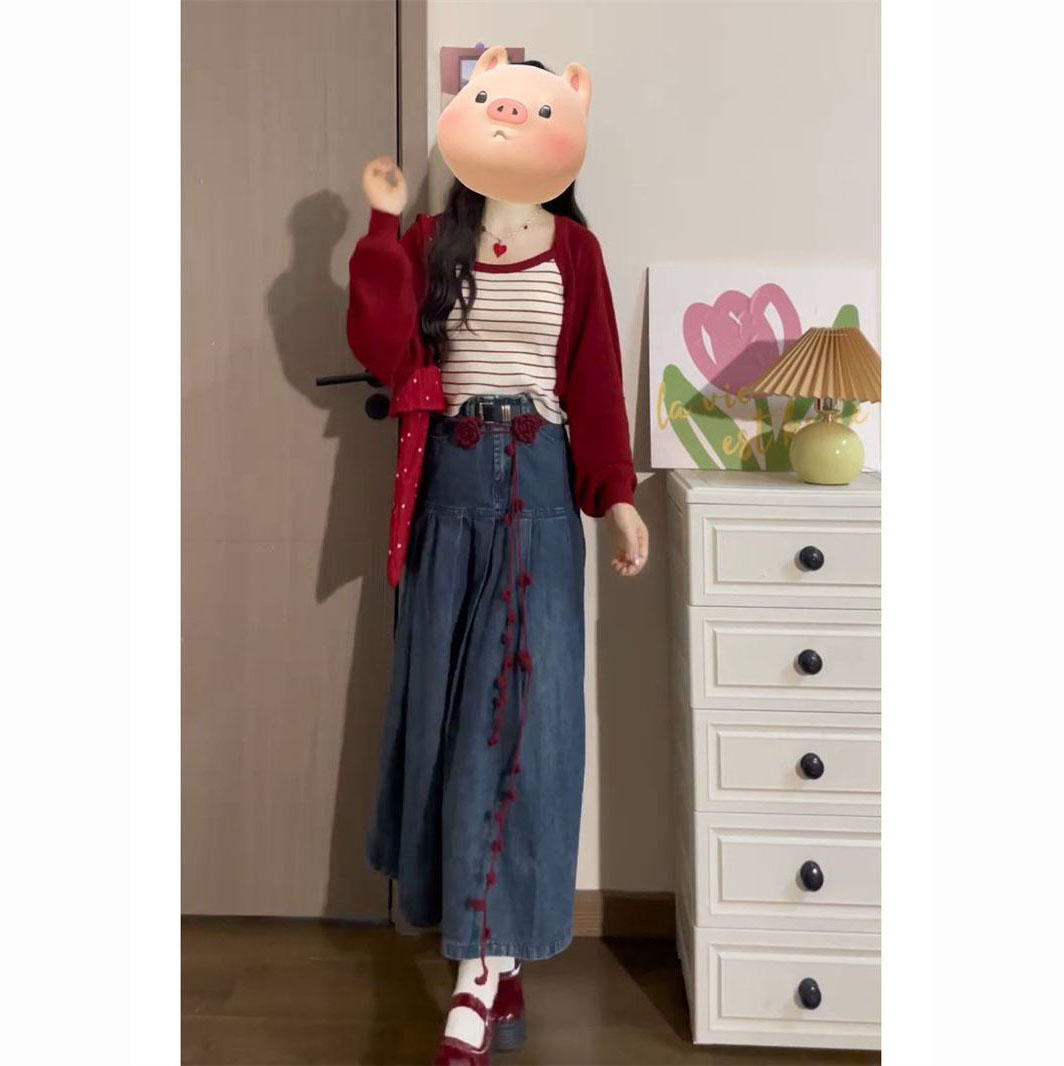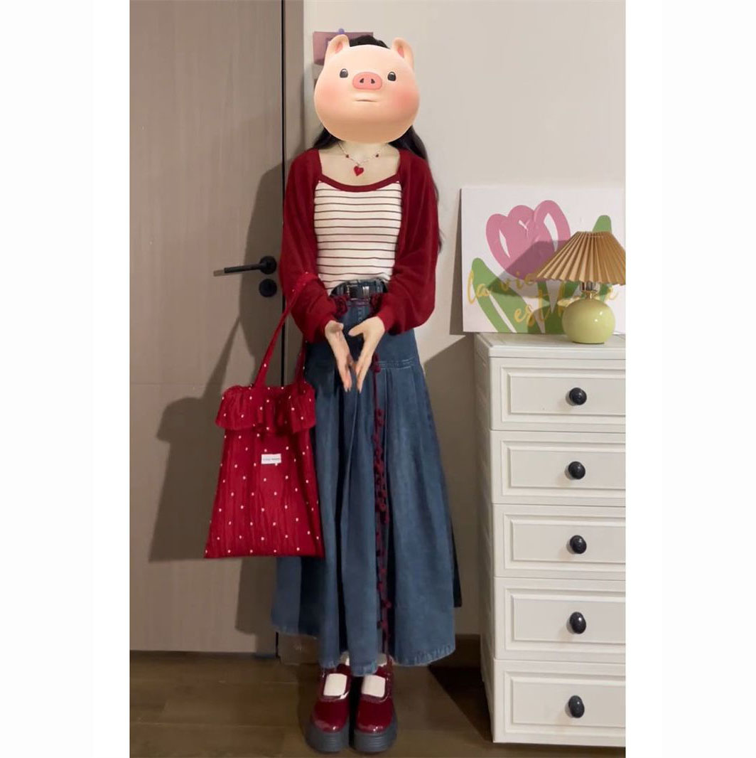 红色开衫+条纹吊带+牛仔半身裙
