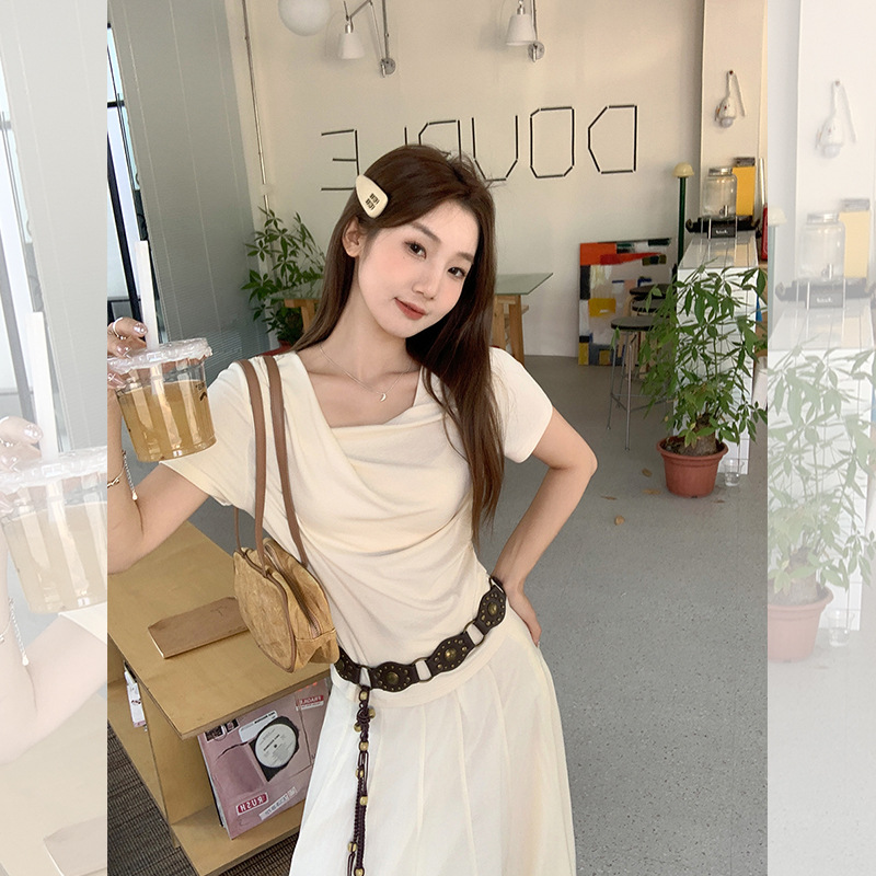 温柔褶皱不规则一字领露肩短袖T恤女2025夏季新款小众设计感上衣