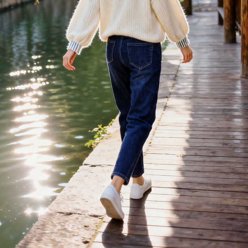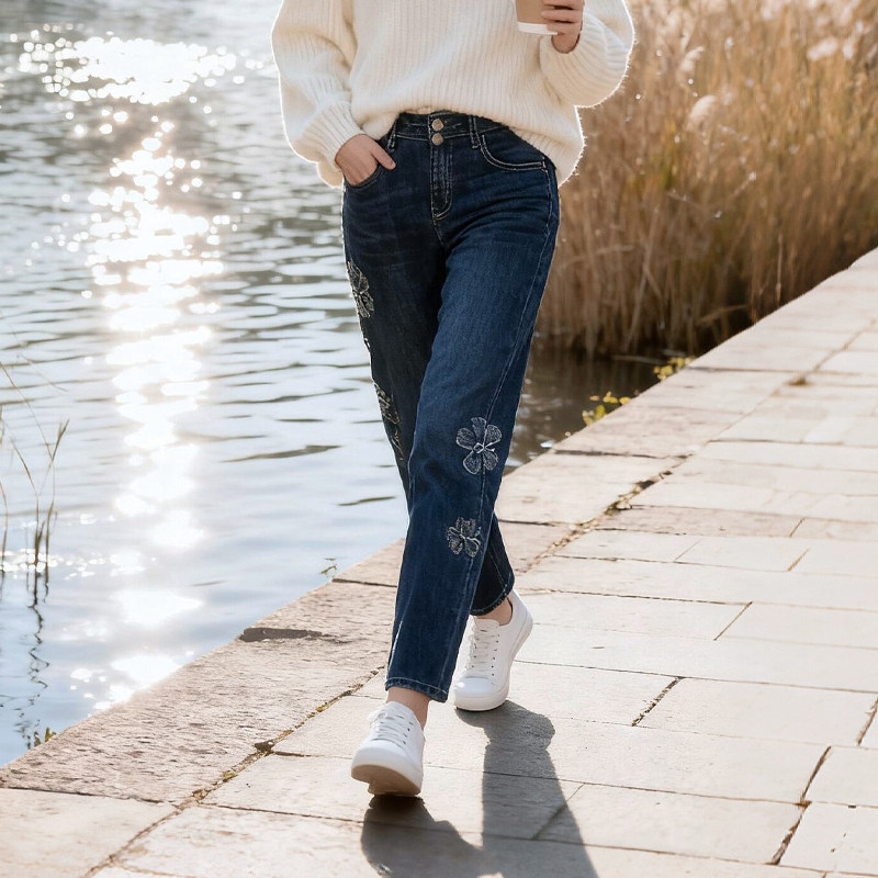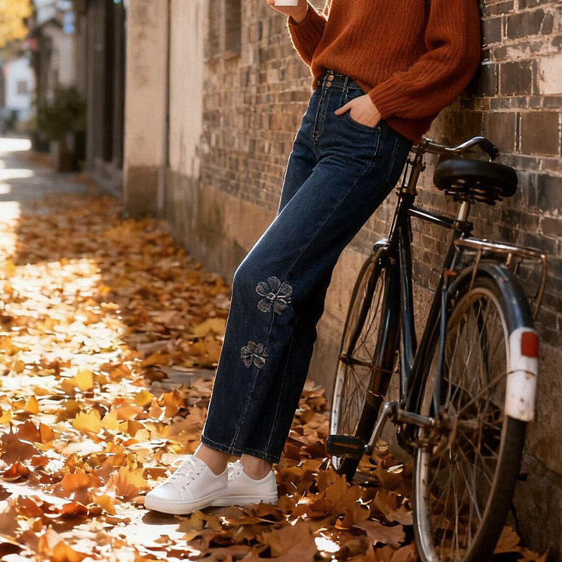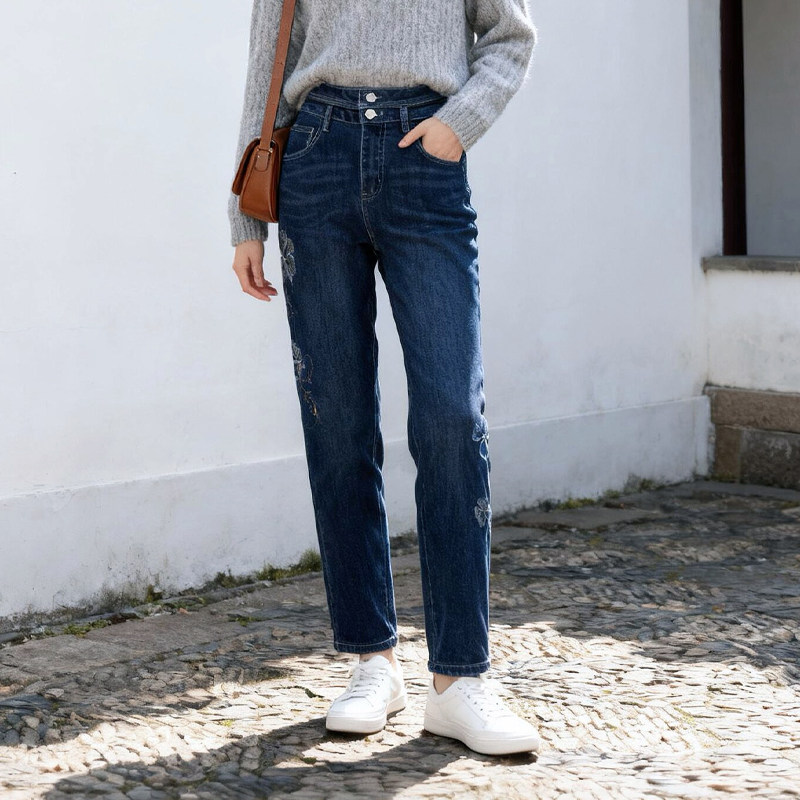 风姿歌2026秋新款刺绣老爹牛仔裤女高腰显瘦九分小个子大码哈伦裤