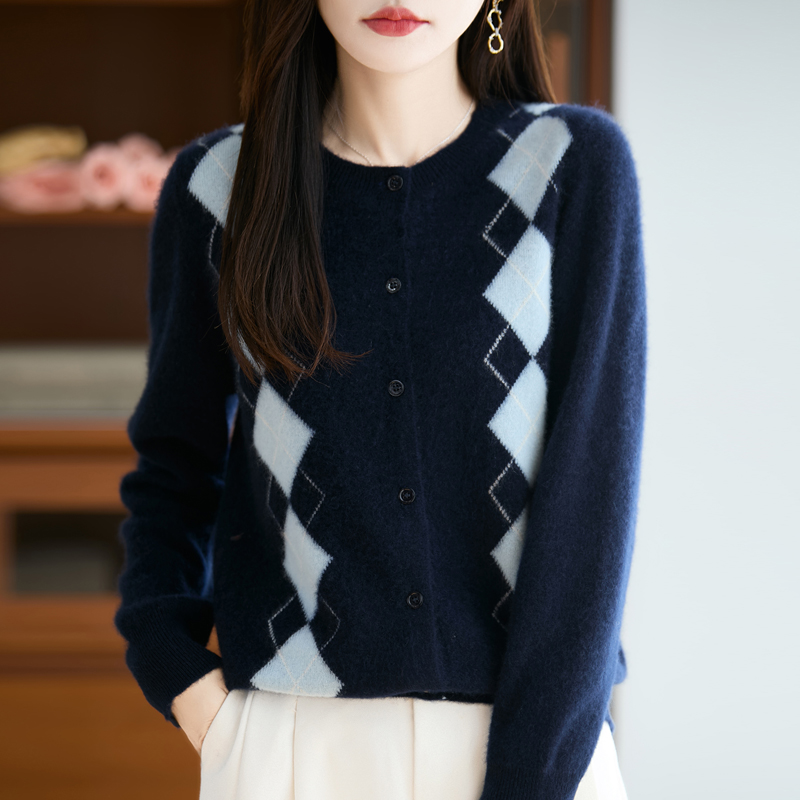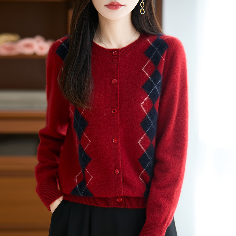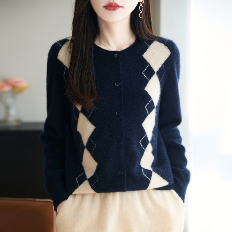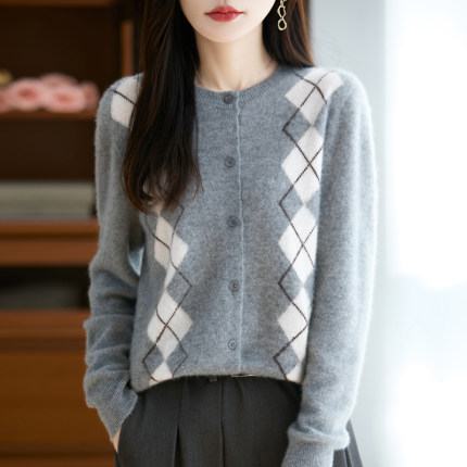 秋冬圆领菱形格100%纯羊毛开衫女宽松针织毛衣外套拼色羊绒衫上衣