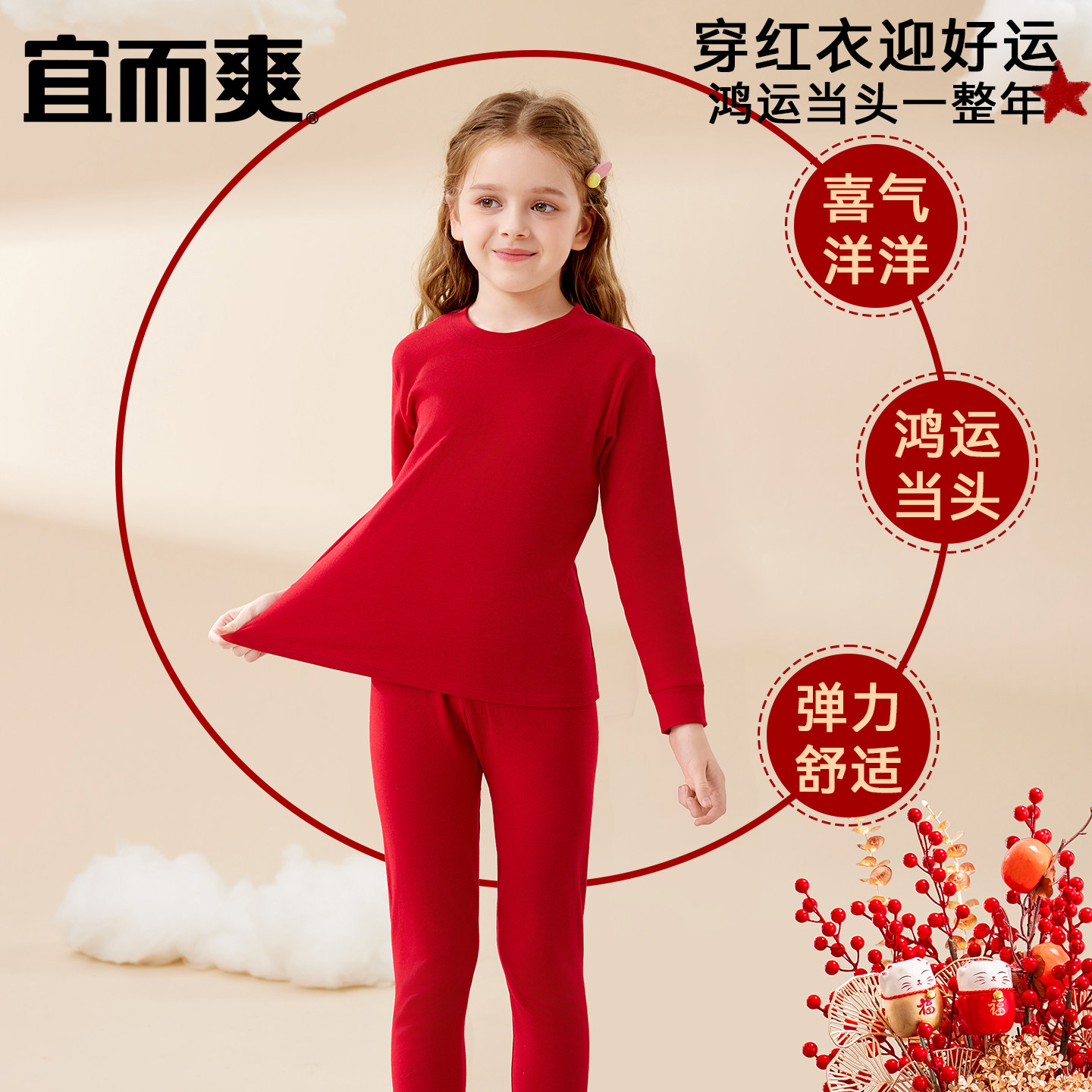 宜而爽儿童本命年保暖内衣套装纯棉12岁男女大童红色马年秋衣秋裤