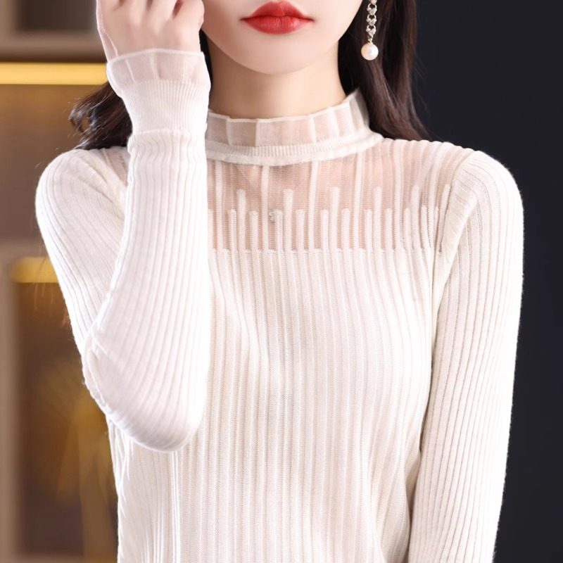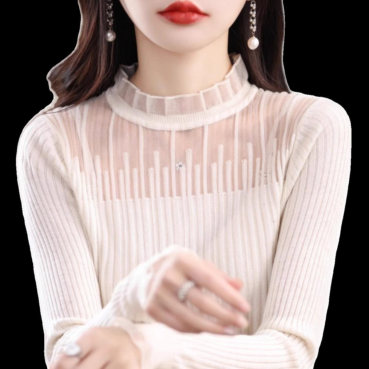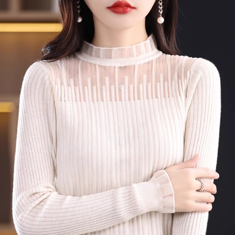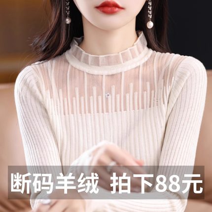 100%纯羊毛打底衫女秋冬新款蕾丝拼接长袖半高领长袖小众针织上衣