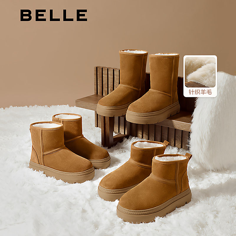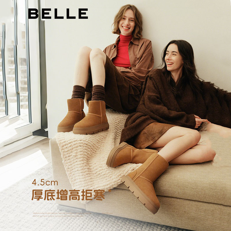 周雨彤百丽女鞋暖墩墩厚底雪地靴高筒美拉德加绒棉鞋短靴E6C1D