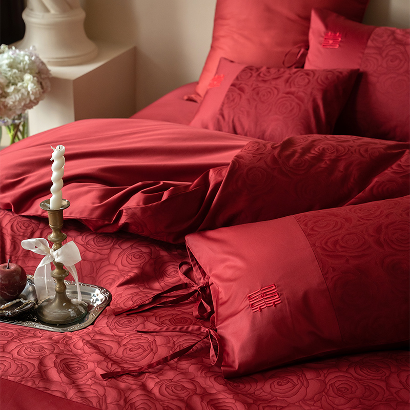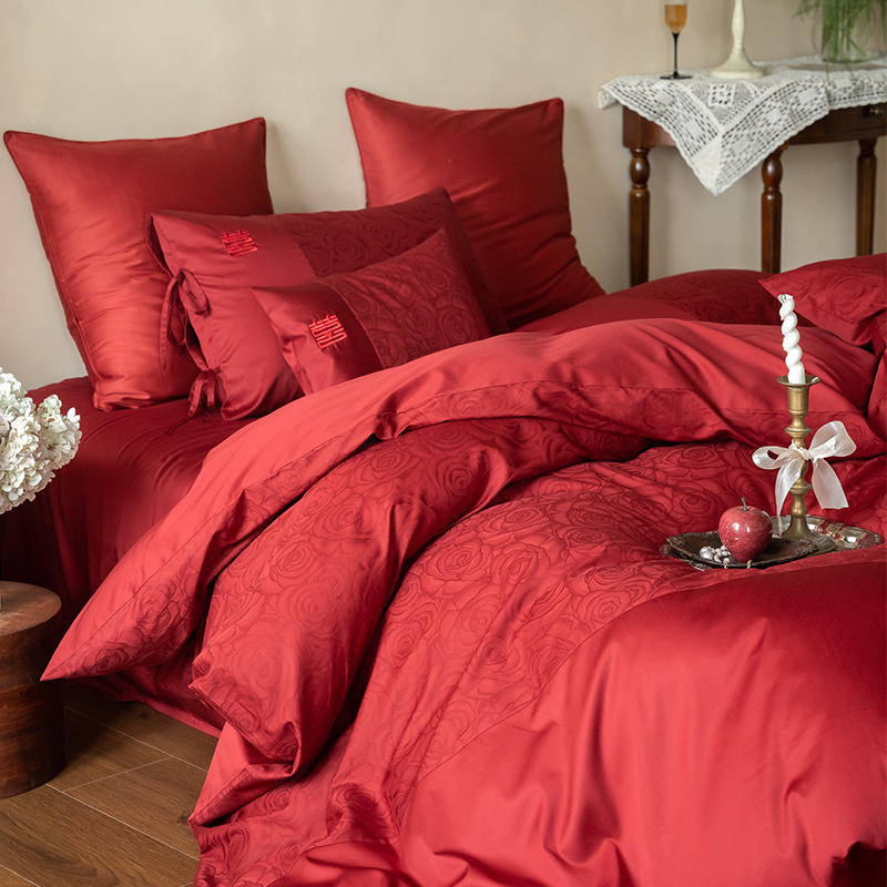 玫瑰提花正红色结婚庆全棉四件套100S长绒棉贡缎纯棉结婚被套床单