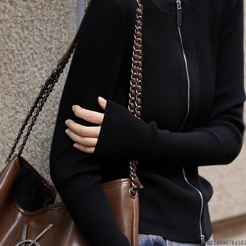 简约圆领坑条拉链羊绒针织外套女秋季薄款修身显瘦短款毛衣开衫女