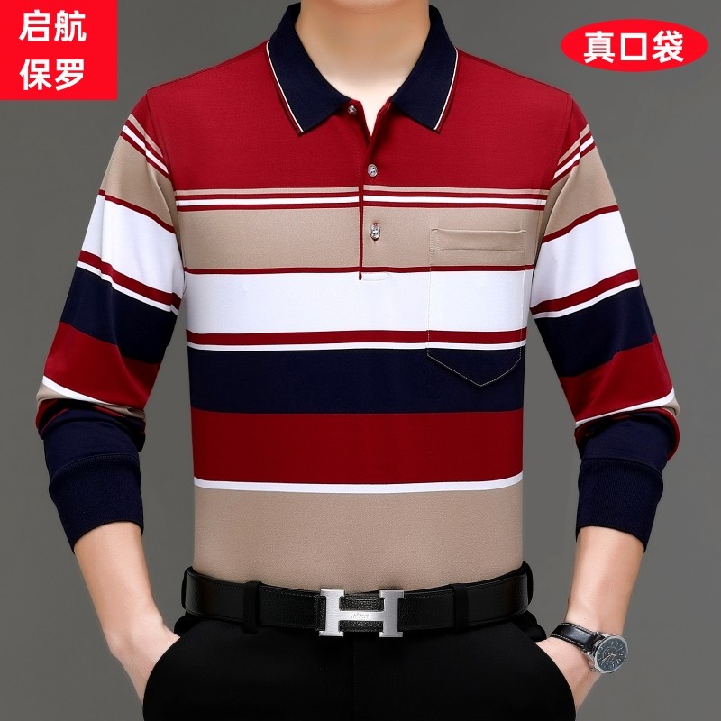 长袖t恤男中年老爸翻领有口袋中老年男士体恤polo衫大码爸爸秋装