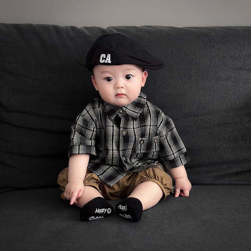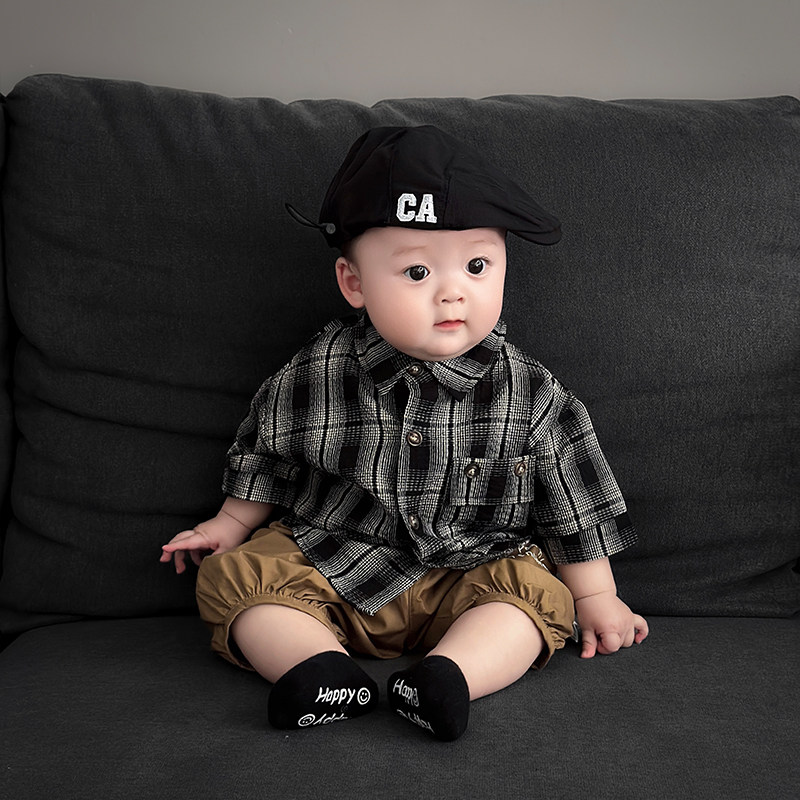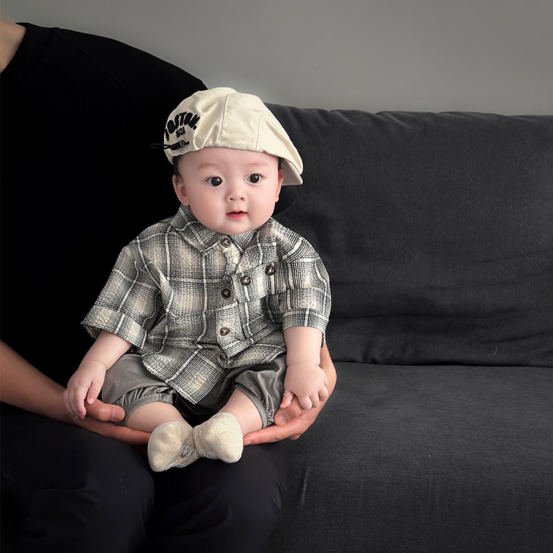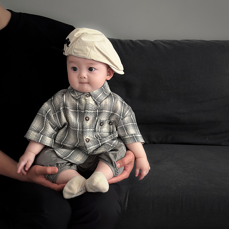 男童夏季薄款短袖短裤套装宝宝洋气格子衬衫婴儿宽松休闲七分裤潮