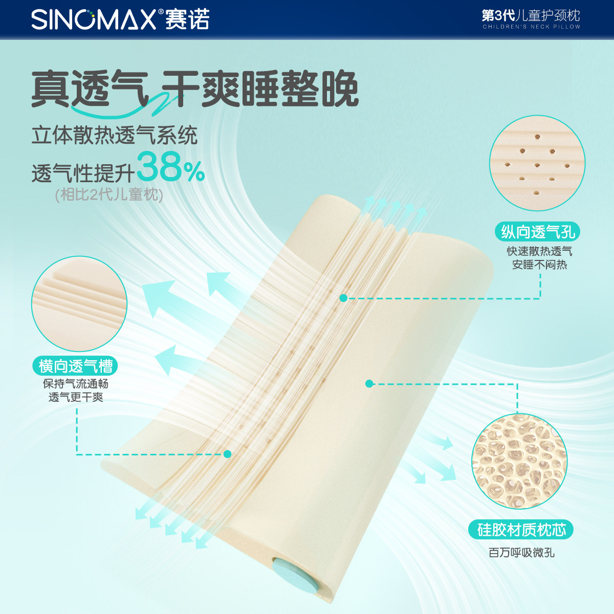 赛诺尼莫撑颈儿童枕头第3代0-13岁小学生枕头硅胶可水洗护颈枕芯