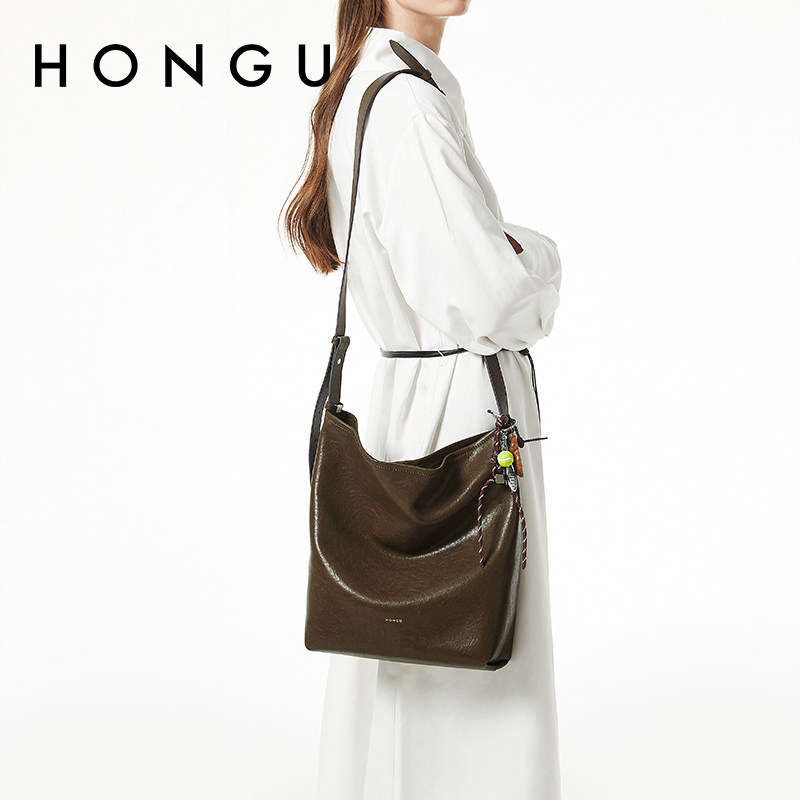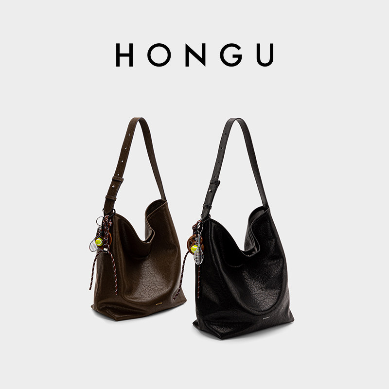 红谷包包2025新款植鞣牛皮单肩腋下包百搭大容量斜挎水桶包女士包
