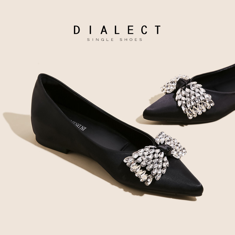 法式尖头单鞋女2025新款真皮蝴蝶结水钻不累脚小个子内增高平底鞋