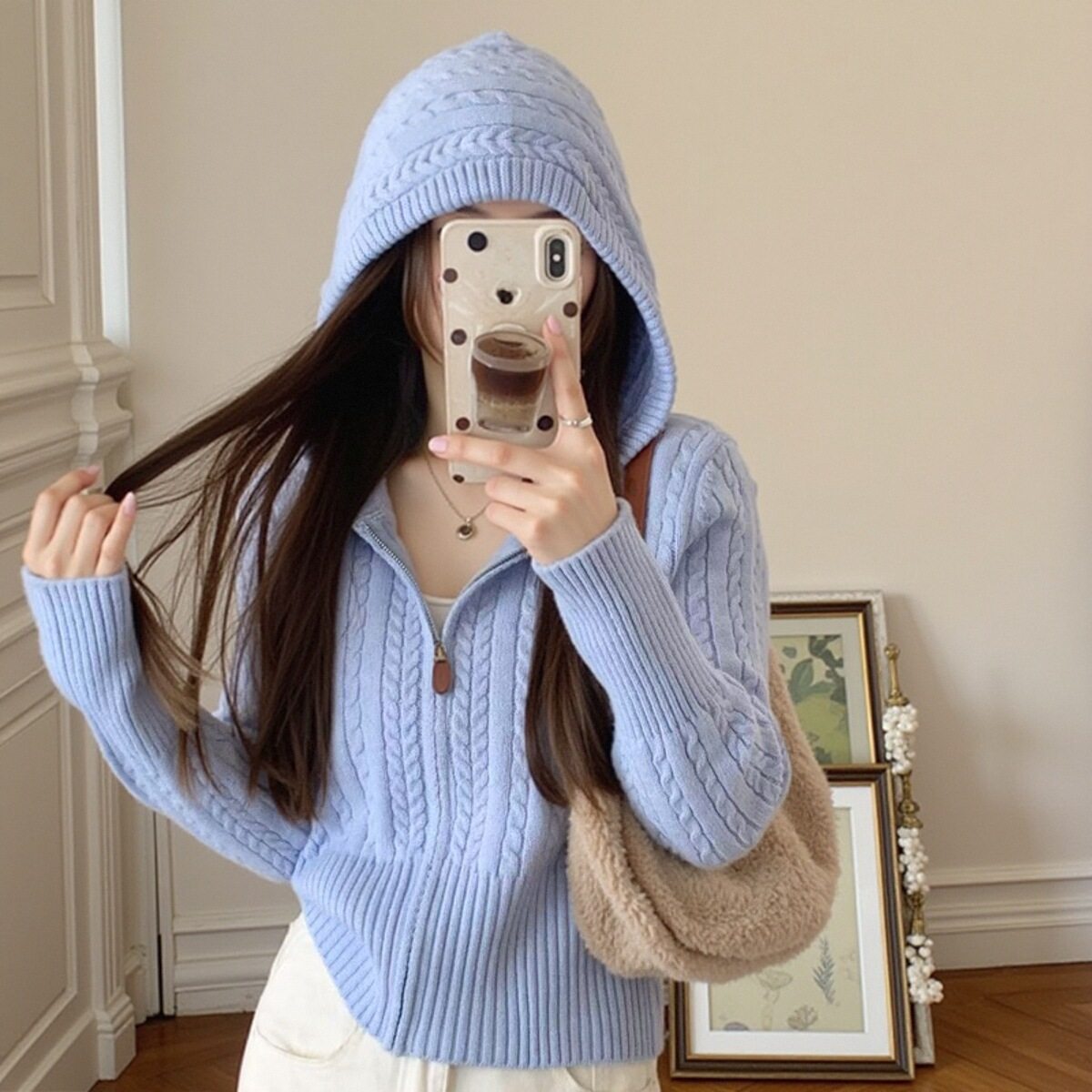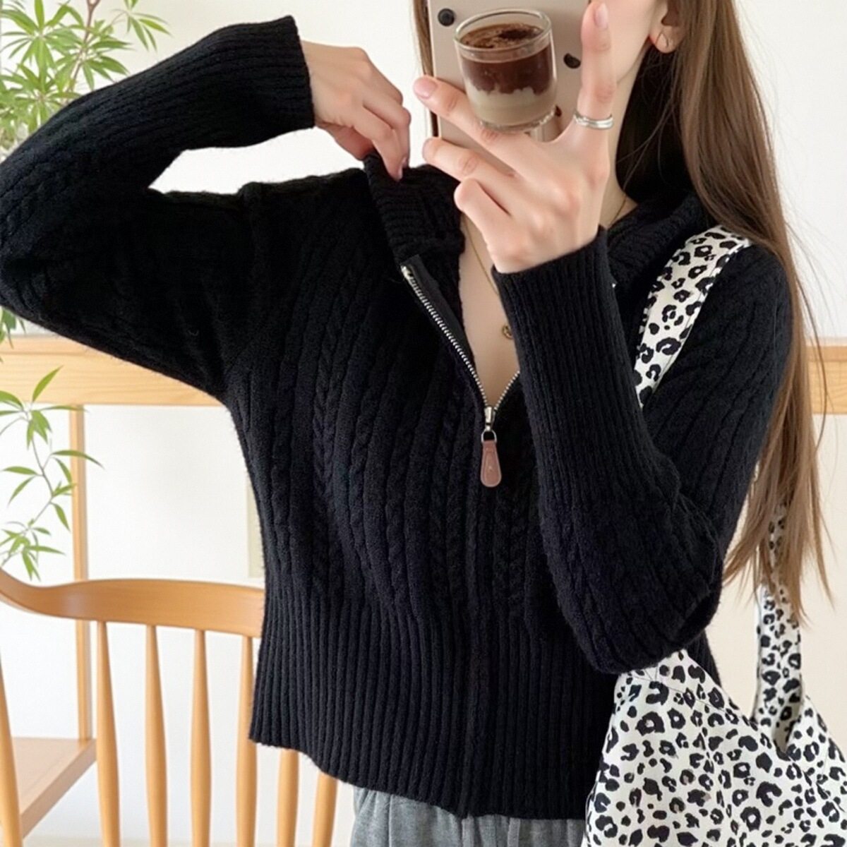 高腰小个子麻花连帽毛衣外套女