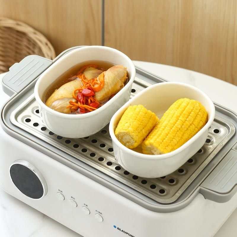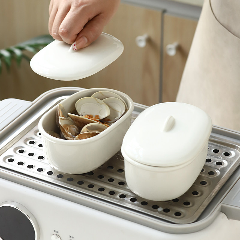 白色简约陶瓷碗带盖子蒸箱蒸锅专用蒸碗椭圆形蒸蛋蒸饭碗甜点碗