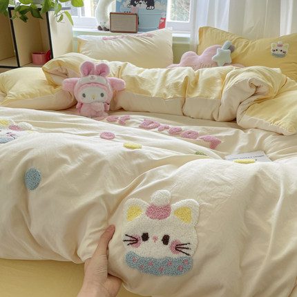 KT猫毛巾绣四件套水洗棉可爱被套罩床单宿舍床上三件套非全棉纯棉