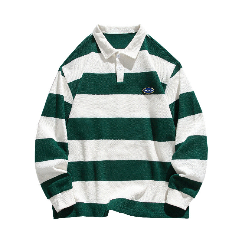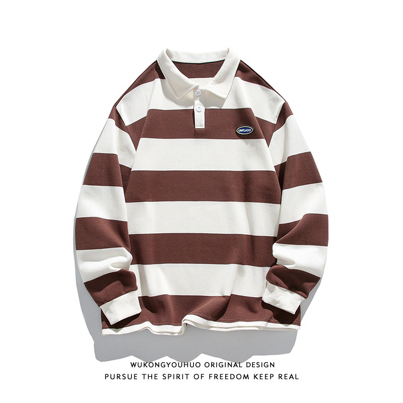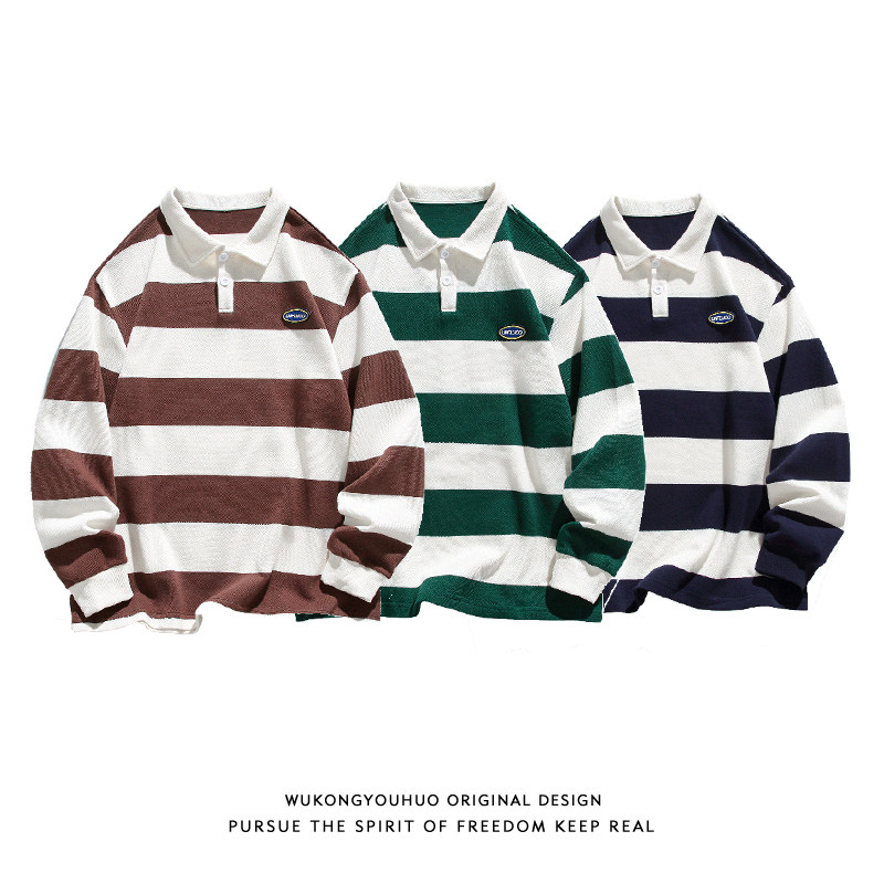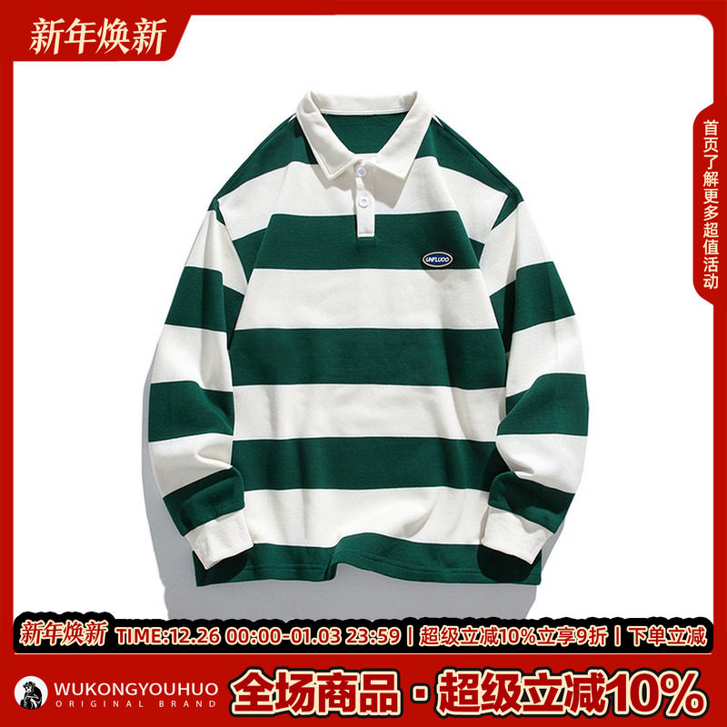 悟空有货秋季日系撞色粗条纹长袖POLO衫男女潮牌宽松情侣休闲衬衣