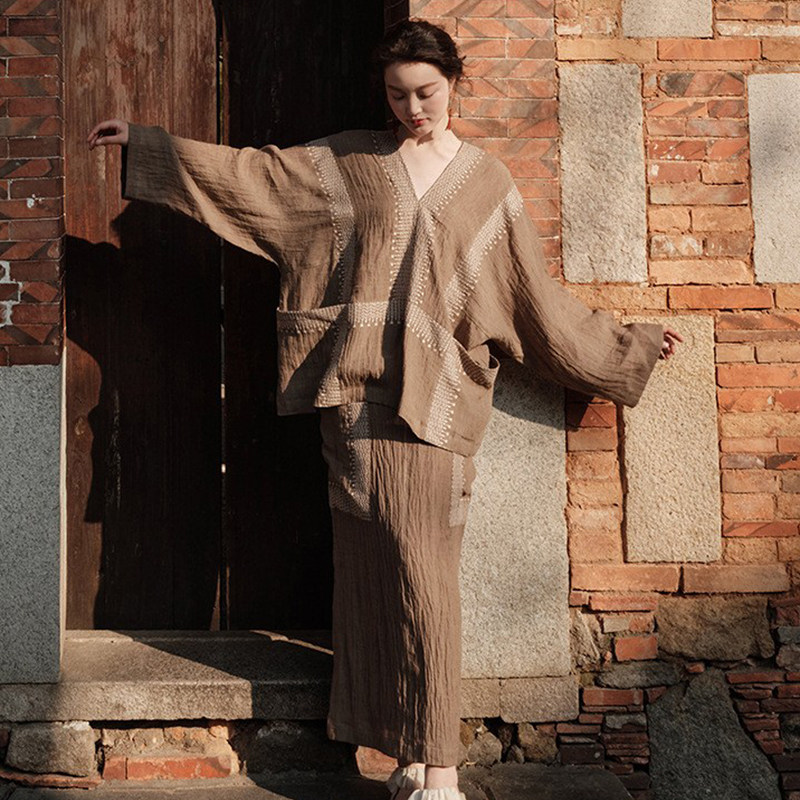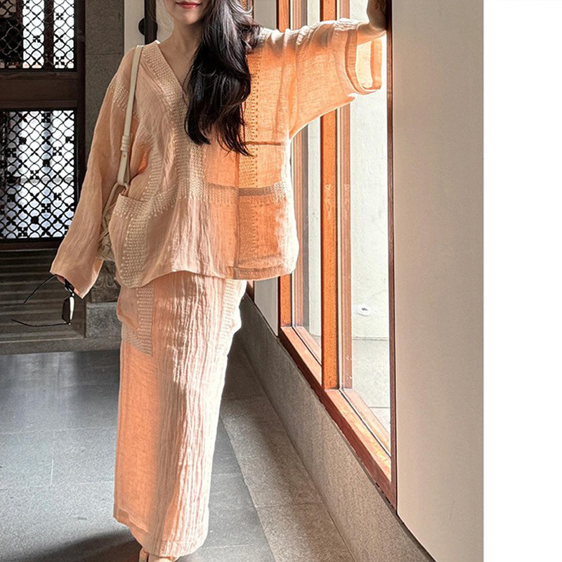 减龄亚麻绣花文艺复古松驰感套装