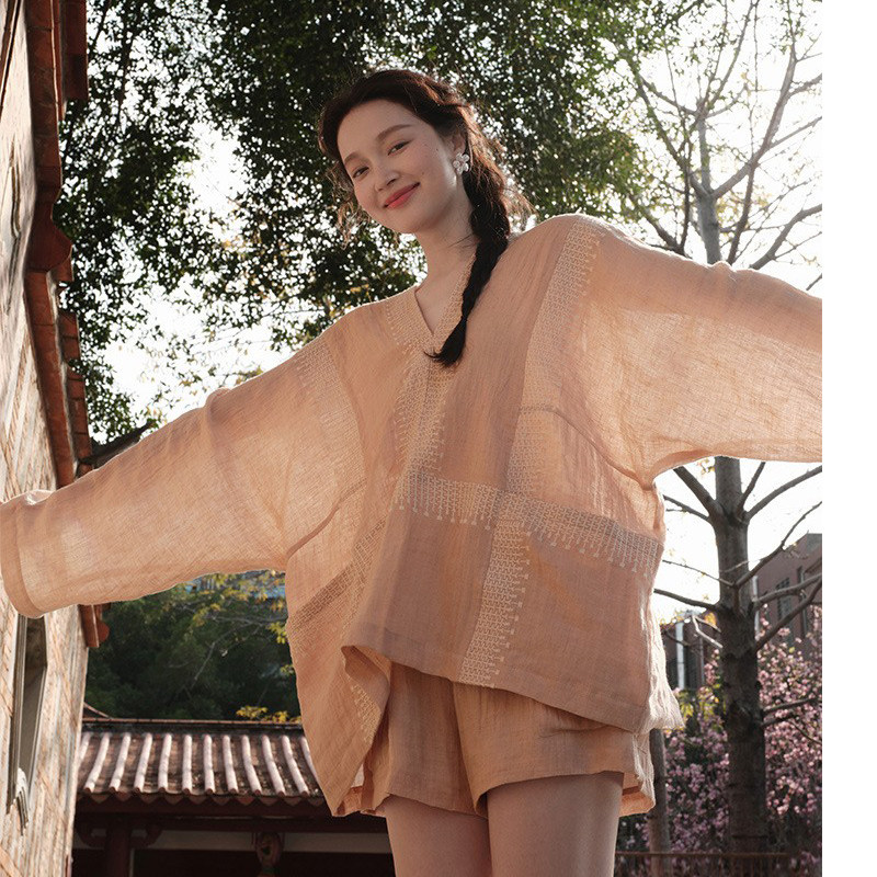 遥寻 春夏减龄刺绣花亚麻文艺复古女装松驰感上衣套装短裤半身裙