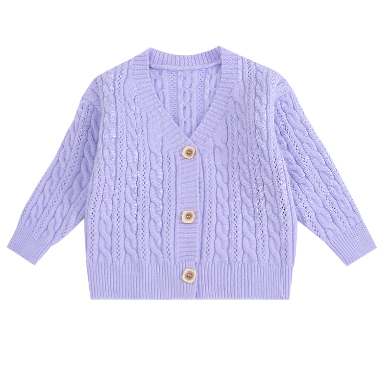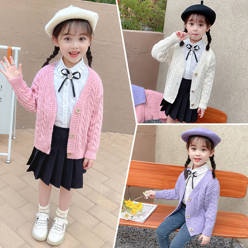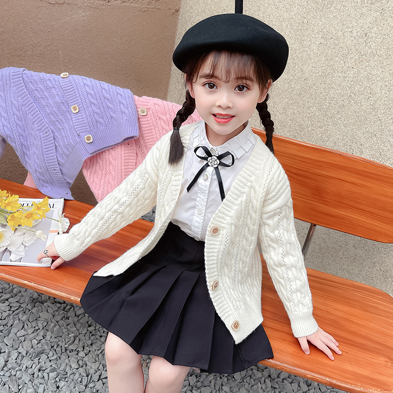 女童针织V领开衫2024春秋新款洋气童装韩版儿童外搭麻花毛衣外套