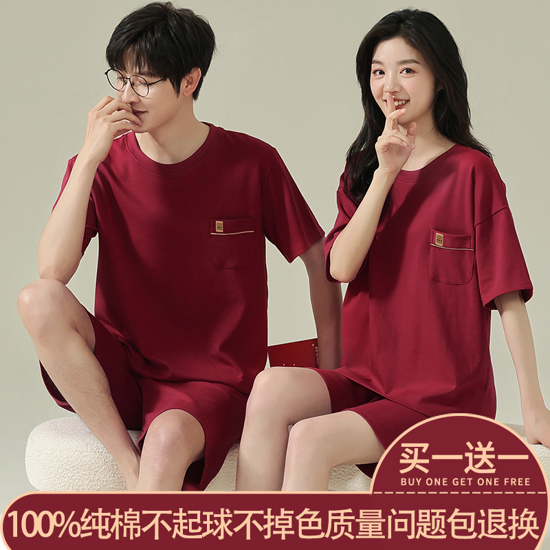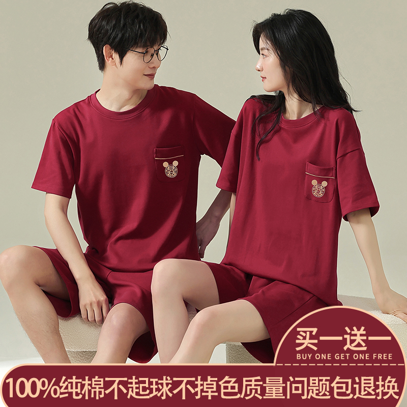 100%纯棉红色睡衣结婚情侣夏季短袖新婚喜庆本命年一男一女套装