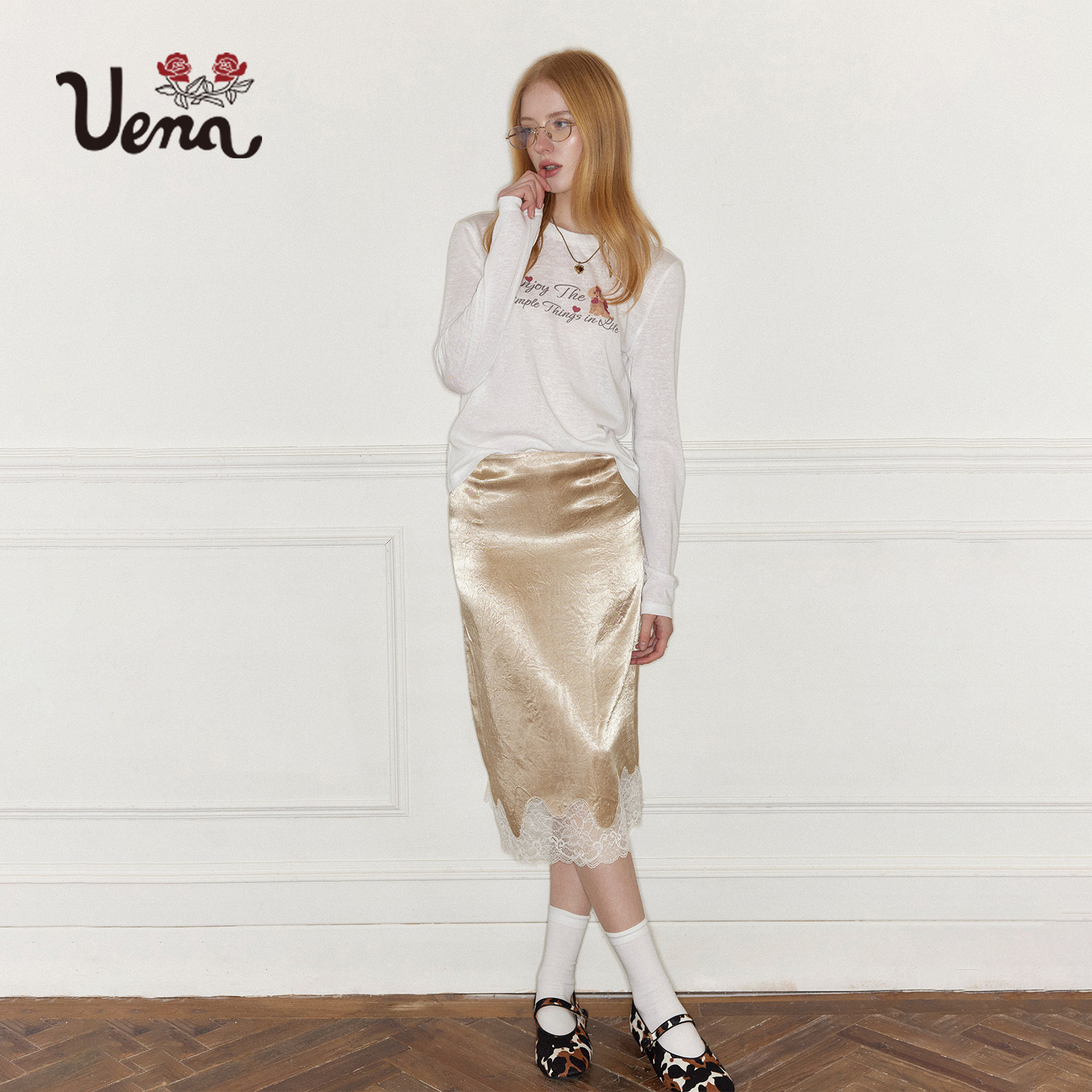 【恬然幽梦】Uena蕾丝花边拼接下摆中长款中腰显瘦缎面半身裙女