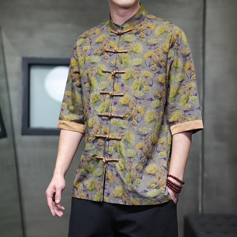 TWG新中式唐装男中国风夏季薄款棉麻短袖衬衫复古大码亚麻五分袖