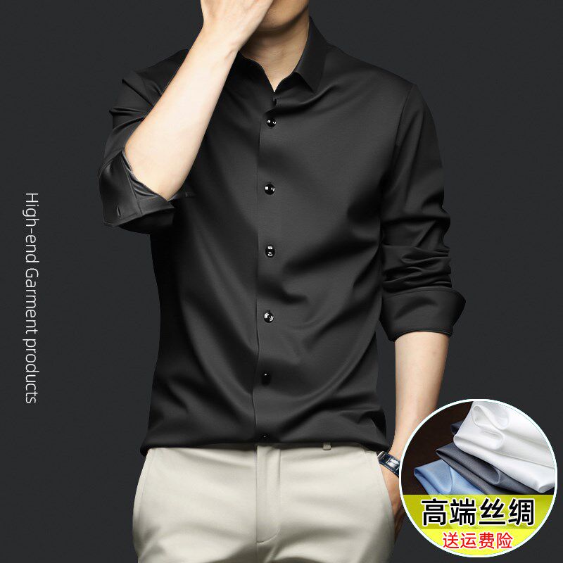 高端丝绸感春秋季衬衫男商务抗皱免烫丝滑高级感弹力大码长袖衬衣