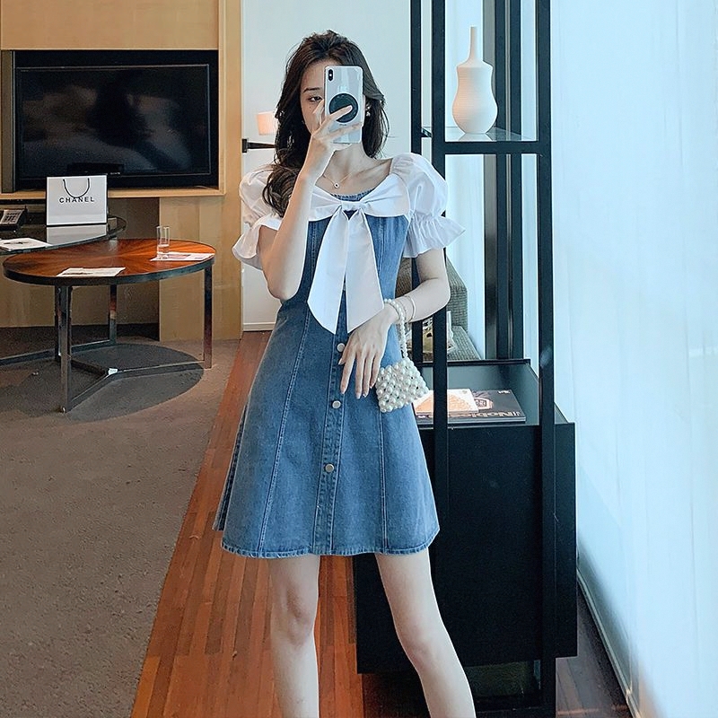 假两件拼接蝴蝶结泡泡袖连衣裙女夏季新款韩版修身显瘦牛仔a字裙